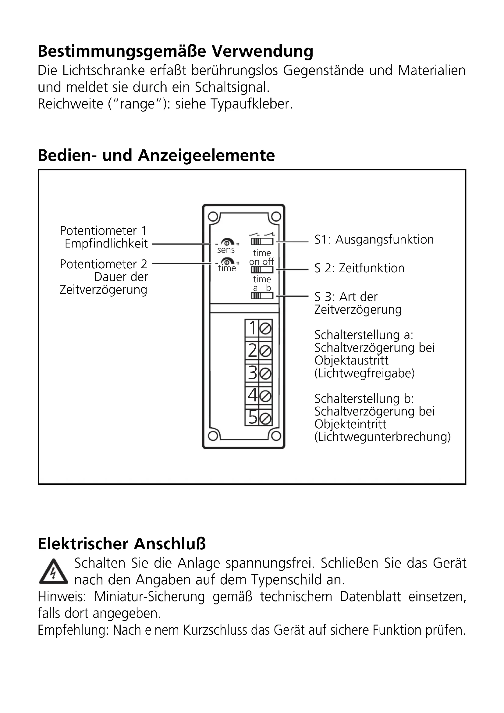 - Maximale Reichweite nur bei genauer Ausrichtung. Testeingang des Senders (nur bei DC-Geräten) Durch Aktivieren des Testeingangs (Test an L-) wird der Sender abge- schaltet. Somit müssen bei freiem Lichtweg zwischen Sender und Emp- fänger die Empfangsanzeige am Empfänger verlöschen und der Schalt- zustand am Ausgang muß sich ändern. Einstellen Stellen Sie Empfindlichkeit, Aus- gangsfunktion, Zeitfunktion und Art und Dauer der Zeitverzöge- rung ein. Schalter 3 = a: Das Signal “kein Objekt vorhanden” wird verzögert an den Schaltaus- gang weitergegeben.