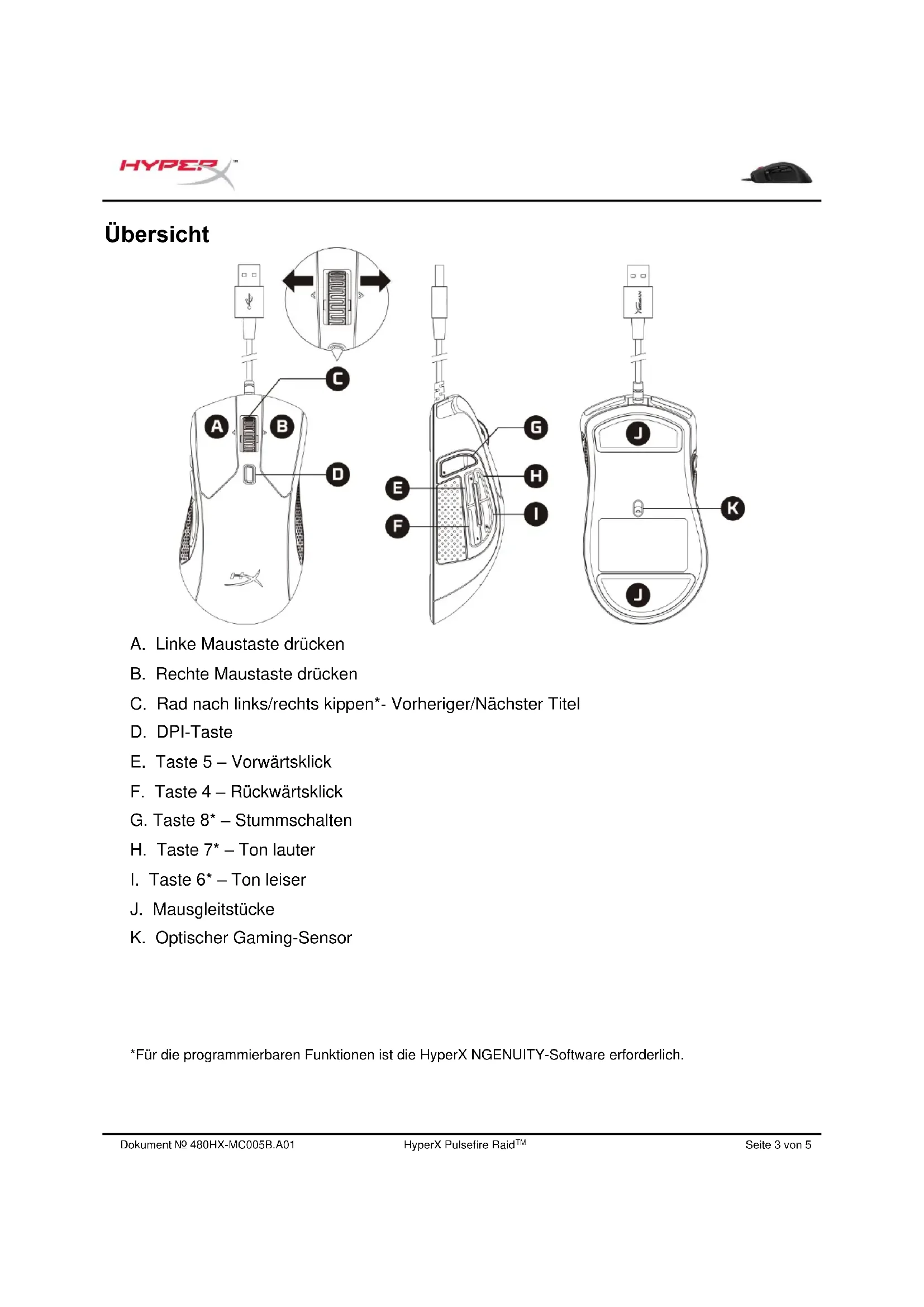 *Für die programmierbaren Funktionen ist die HyperX NGENUITY-Software erforderlich.Dokument Nr. 480HX-MC005B.A01 HyperX Pulsefire Raid