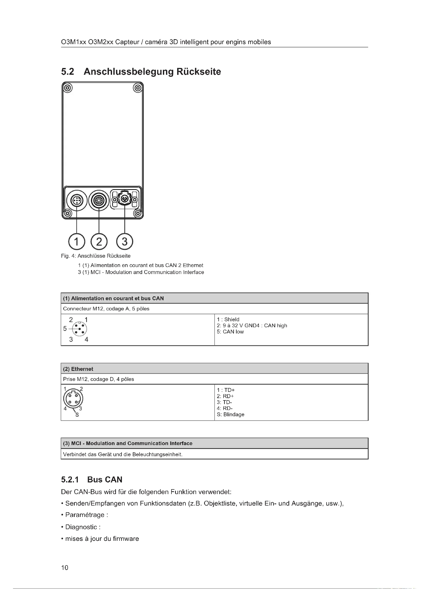 Fig.5: Anschlüsse Unterseite 1 Sortie vidéo analogique (PAL). Sortie vidéo analogique (PAL). Connecteur M12, codage A, 5 pôles 1: Shield 3: GND4: FBAS (Video) Für den analogen Videoausgang nur die folgenden ifm-Kabel verwenden: w E3M151 (5 m, Verbindungskabel, abgewinkelter Stecker) E3M152 (11 m, Verbindungskabel, abgewinkelter Stecker) E3M153 (16 m, Verbindungskabel, abgewinkelter Stecker) E3M154 (21 m, Verbindungskabel, abgewinkelter Stecker) E3M159 (5 m, Verbindungskabel) E3M160 (1 m, Video-Adapterkabel)O3M1xx O3M2xx Capteur / caméra 3D intelligent pour engins mobiles