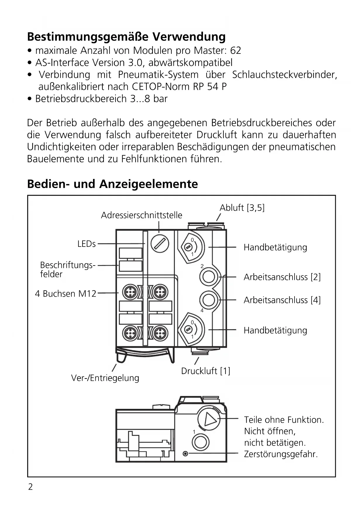 - Betriebsdruckbereich 3...8 bar Der Betrieb außerhalb des angegebenen Betriebsdruckbereiches oder die Verwendung falsch aufbereiteter Druckluft kann zu dauerhaften Undichtigkeiten oder irreparablen Beschädigungen der pneumatischen Bauelemente und zu Fehlfunktionen führen. Bedien- und Anzeigeelemente