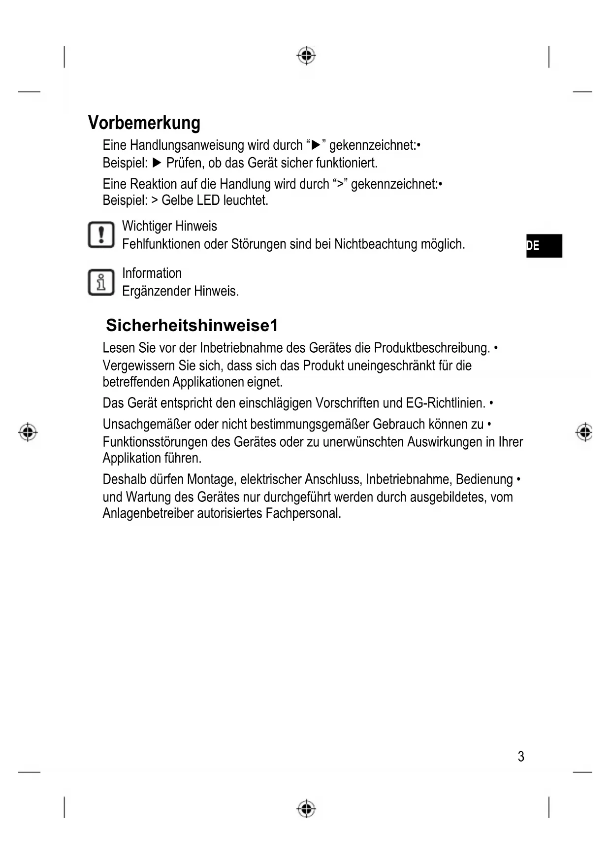Vorbemerkung Eine Handlungsanweisung wird durch “►” gekennzeichnet:• Beispiel: ► Prüfen, ob das Gerät sicher funktioniert. Eine Reaktion auf die Handlung wird durch “>” gekennzeichnet:• Beispiel: > Gelbe LED leuchtet. Wichtiger Hinweis Fehlfunktionen oder Störungen sind bei Nichtbeachtung möglich. Information Ergänzender Hinweis. Sicherheitshinweise1 Lesen Sie vor der Inbetriebnahme des Gerätes die Produktbeschreibung. • Vergewissern Sie sich, dass sich das Produkt uneingeschränkt für die betreffenden Applikationen eignet. Das Gerät entspricht den einschlägigen Vorschriften und EG-Richtlinien. • Unsachgemäßer oder nicht bestimmungsgemäßer Gebrauch können zu • Funktionsstörungen des Gerätes oder zu unerwünschten Auswirkungen in Ihrer Applikation führen. Deshalb dürfen Montage, elektrischer Anschluss, Inbetriebnahme, Bedienung • und Wartung des Gerätes nur durchgeführt werden durch ausgebildetes, vom Anlagenbetreiber autorisiertes Fachpersonal.4 Bestimmungsgemäße Verwendung2 Der kapazitive Sensor erfasst berührungslos Metalle, nahezu alle Kunststoffe, • Glas, Keramik, Holz, Papier, Öle, Fette, Wasser und alle wasserhaltigen Materialien und meldet sie durch ein Schaltsignal. Montage3 Hinweise für den bündigen und nichtbündigen Einbau3.1 Beim bündigen Einbau nichtbündiger Geräte verändern sich die Sensoreigenschaften bis hin zum Durchschalten (Funktionsverlust). Freiräume an der aktiven Fläche beachten. ► 3xs