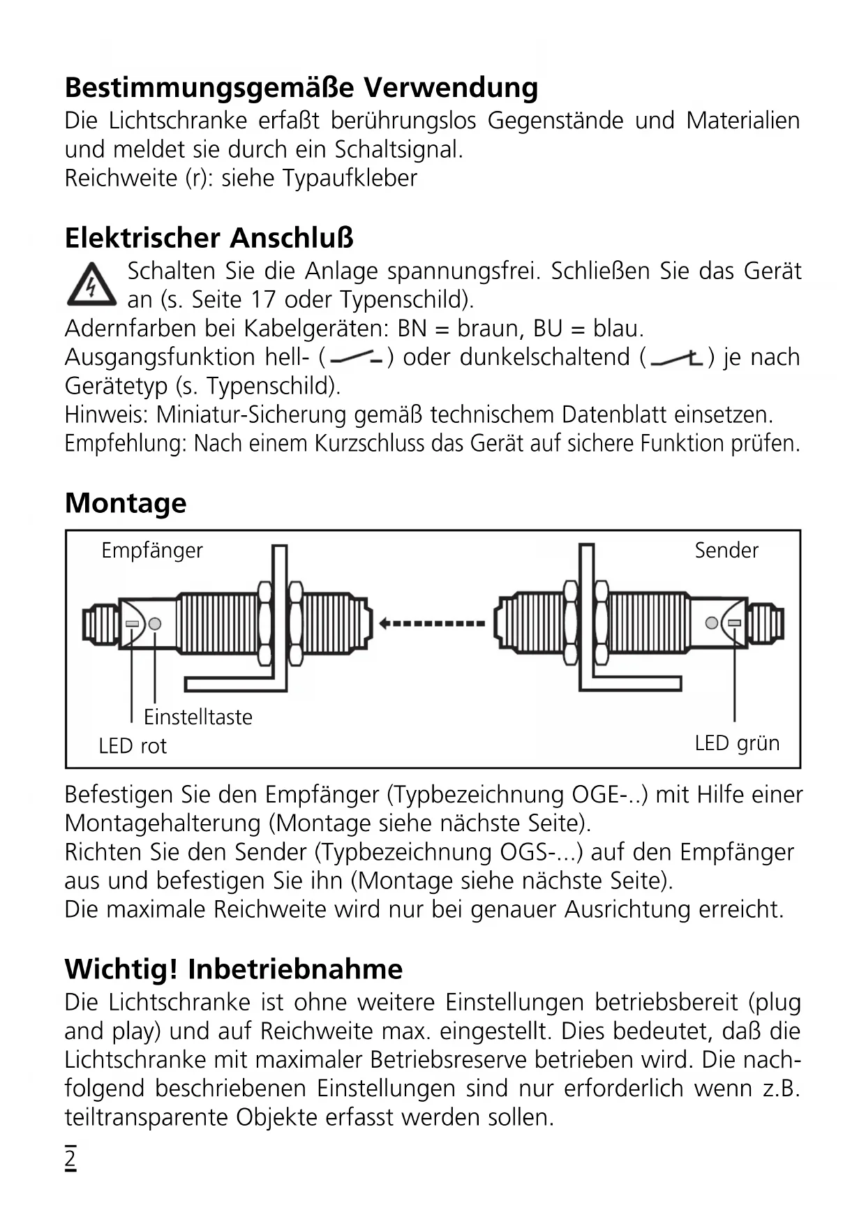 701260 / 04 09 / 2007Bestimmungsgemäße Verwendung Die Lichtschranke erfaßt berührungslos Gegenstände und Materialien und meldet sie durch ein Schaltsignal. Reichweite (r): siehe Typaufkleber Elektrischer Anschluß Schalten Sie die Anlage spannungsfrei. Schließen Sie das Gerät an (s. Seite 17 oder Typenschild). Adernfarben bei Kabelgeräten: BN = braun, BU = blau. Ausgangsfunktion hell- ( ) oder dunkelschaltend ( ) je nach Gerätetyp (s. Typenschild). Hinweis: Miniatur-Sicherung gemäß technischem Datenblatt einsetzen. Empfehlung: Nach einem Kurzschluss das Gerät auf sichere Funktion prüfen. Montage Befestigen Sie den Empfänger (Typbezeichnung OGE-..) mit Hilfe einer Montagehalterung (Montage siehe nächste Seite). Richten Sie den Sender (Typbezeichnung OGS-...) auf den Empfänger aus und befestigen Sie ihn (Montage siehe nächste Seite). Die maximale Reichweite wird nur bei genauer Ausrichtung erreicht. Wichtig! Inbetriebnahme Die Lichtschranke ist ohne weitere Einstellungen betriebsbereit (plug and play) und auf Reichweite max. eingestellt. Dies bedeutet, daß die Lichtschranke mit maximaler Betriebsreserve betrieben wird. Die nach- folgend beschriebenen Einstellungen sind nur erforderlich wenn z.B. teiltransparente Objekte erfasst werden sollen.