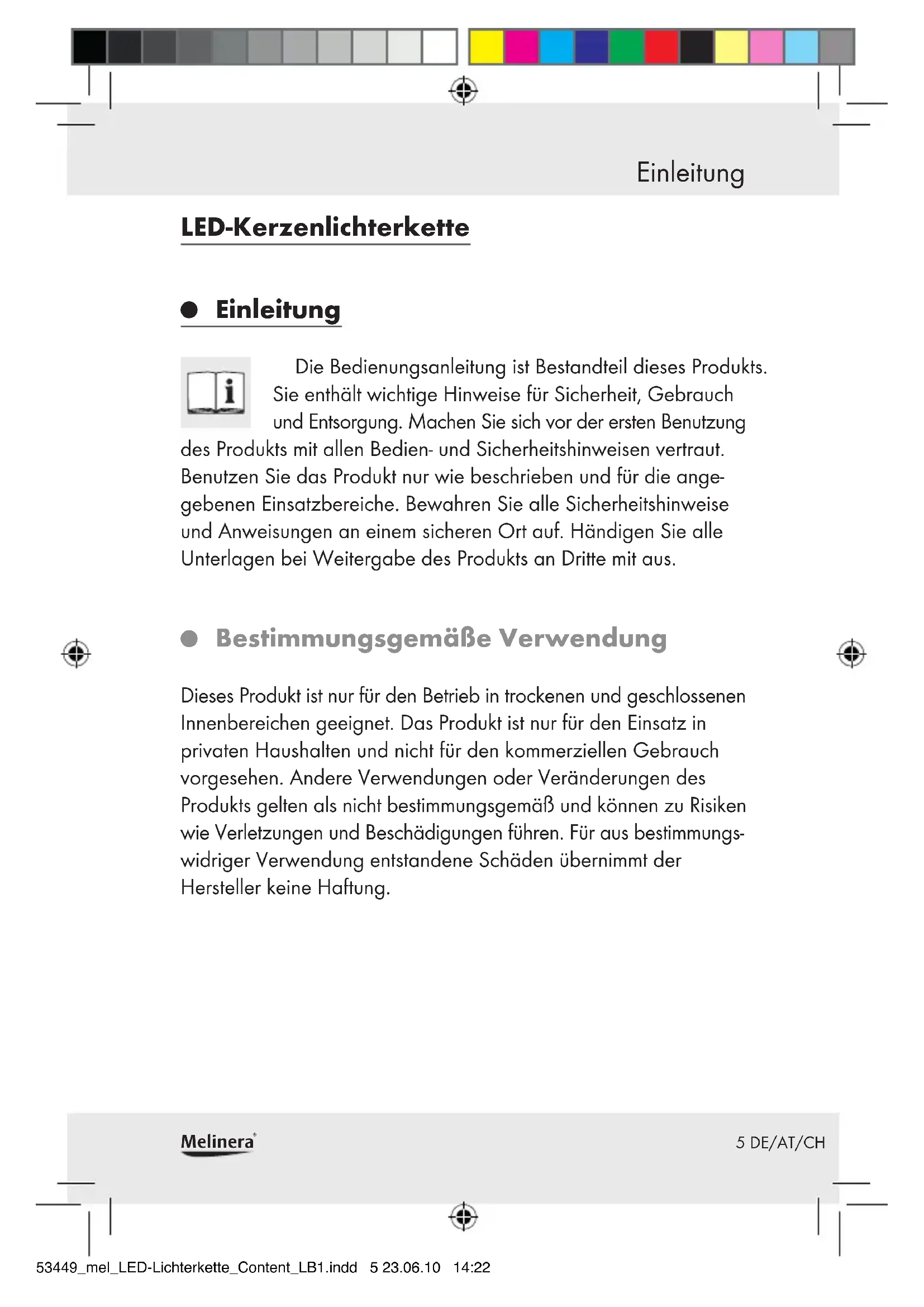Bestimmungsgemäße Verwendung Dieses Produkt ist nur für den Betrieb in trockenen und geschlossenen Innenbereichen geeignet. Das Produkt ist nur für den Einsatz in privaten Haushalten und nicht für den kommerziellen Gebrauch vorgesehen. Andere Verwendungen oder Veränderungen des Produkts gelten als nicht bestimmungsgemäß und können zu Risiken wie Verletzungen und Beschädigungen führen. Für aus bestimmungs- widriger Verwendung entstandene Schäden übernimmt der Hersteller keine Haftung. 53449_mel_LED-Lichterkette_Content_LB1.indd 5 23.06.10 14:226 DE/AT/CH Melinera
