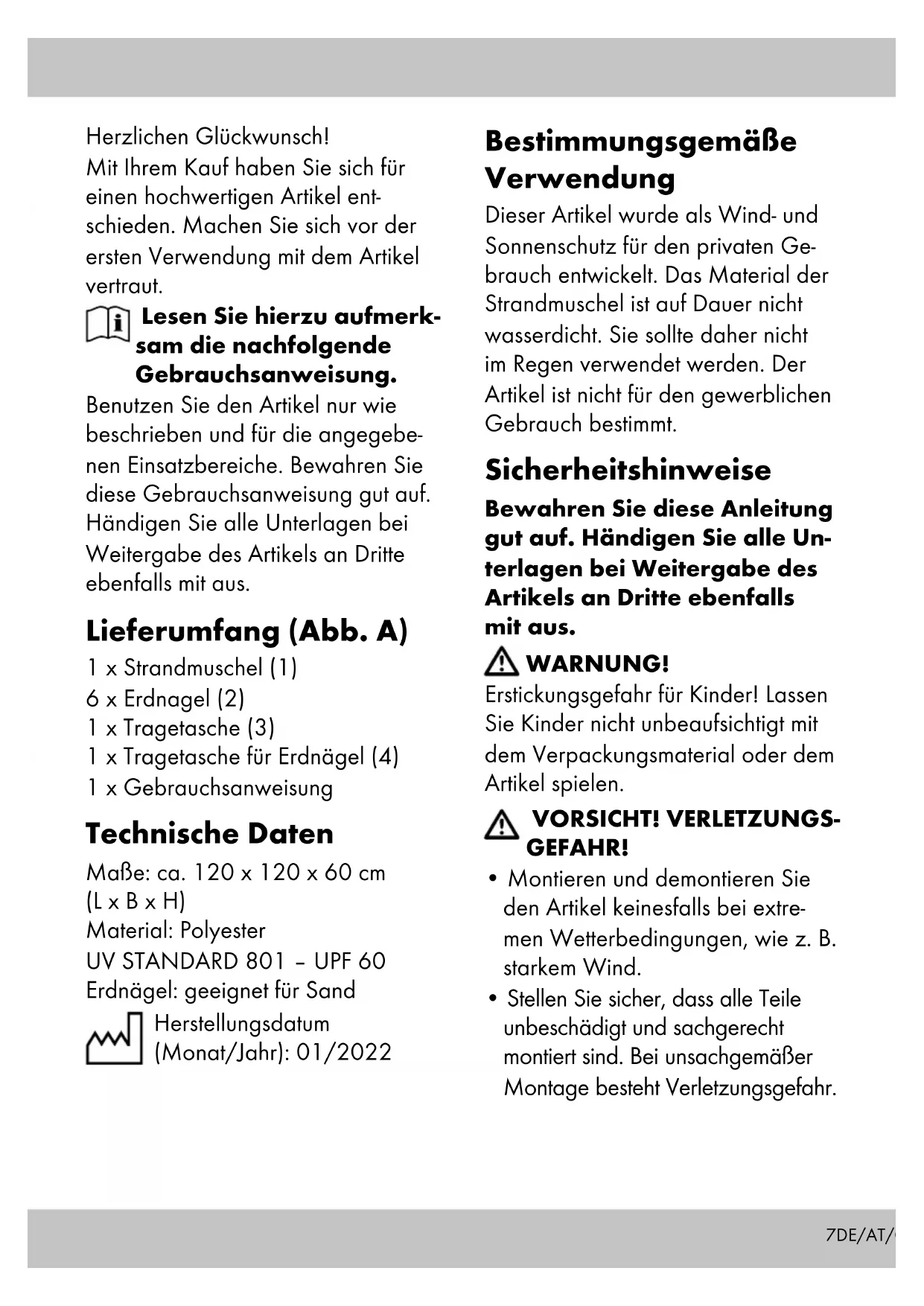 Erdnägel: geeignet für Sand Herstellungsdatum (Monat/Jahr): 01/2022 Bestimmungsgemäße Verwendung Dieser Artikel wurde als Wind- und Sonnenschutz für den privaten Ge- brauch entwickelt. Das Material der Strandmuschel ist auf Dauer nicht wasserdicht. Sie sollte daher nicht im Regen verwendet werden. Der Artikel ist nicht für den gewerblichen Gebrauch bestimmt. Sicherheitshinweise Bewahren Sie diese Anleitung gut auf. Händigen Sie alle Un- terlagen bei Weitergabe des Artikels an Dritte ebenfalls mit aus. WARNUNG! Erstickungsgefahr für Kinder! Lassen Sie Kinder nicht unbeaufsichtigt mit dem Verpackungsmaterial oder dem Artikel spielen. VORSICHT! VERLETZUNGS- GEFAHR!