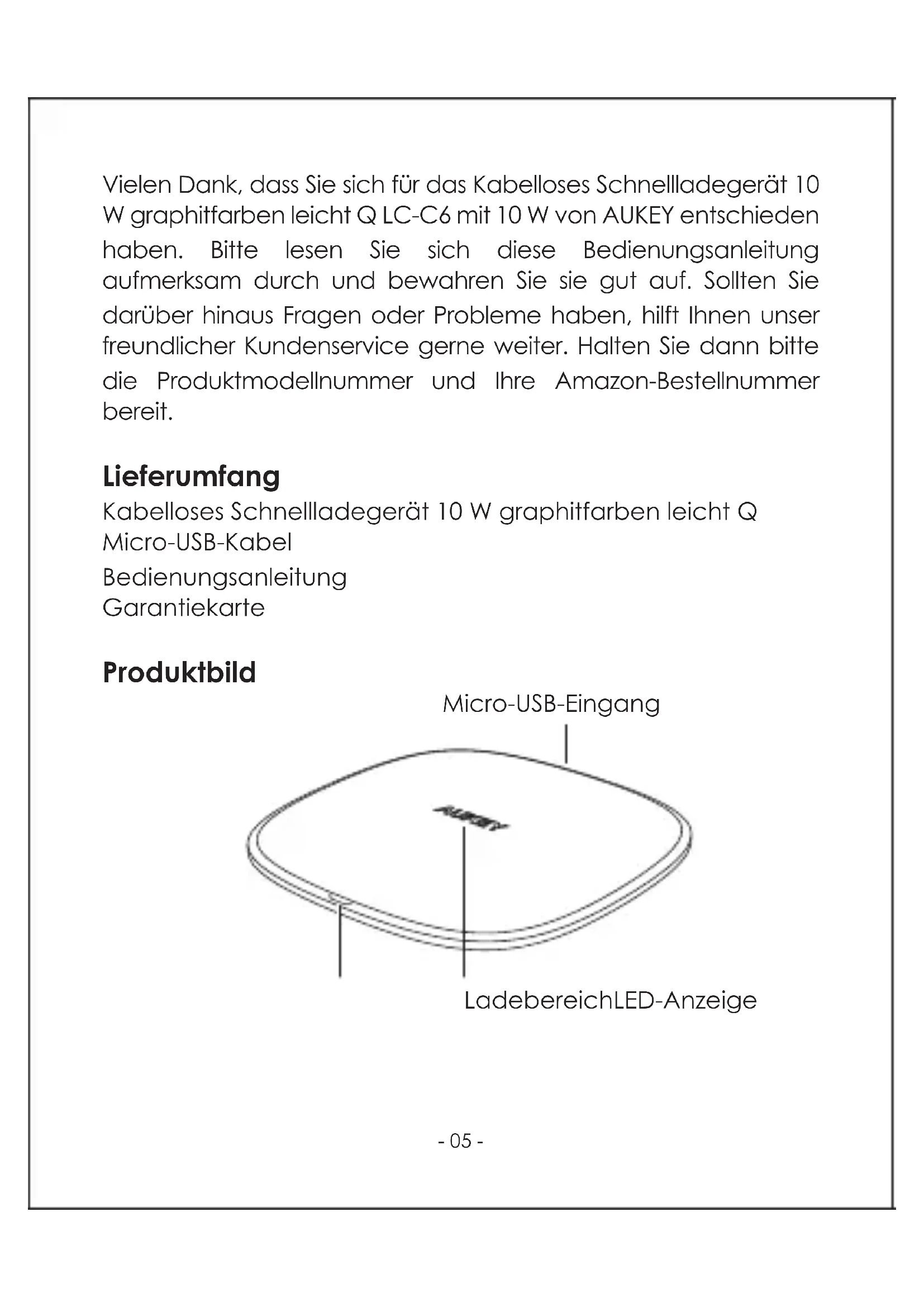 Product Care Indicator Red Green Flashing Red Status Standby Charging / Fully charged Charging error LED Indicator- 04- Warranty & Customer Support For questions, support, or warranty claims, contact us at the address below that corresponds with your region. Please include your Amazon order number and product model number. Amazon US orders: support.us@aukey.com Amazon EU orders: support.eu@aukey.com Amazon CA orders: support.ca@aukey.com Amazon JP orders: support.jp@aukey.com *Please note, AUKEY can only provide after sales service for products purchased directly from AUKEY. If you have purchased from a different seller, please contact them directly for service or warranty issues.- 05 - Vielen Dank, dass Sie sich für das Kabelloses Schnellladegerät 10 W graphitfarben leicht Q LC-C6 mit 10 W von AUKEY entschieden haben. Bitte lesen Sie sich diese Bedienungsanleitung aufmerksam durch und bewahren Sie sie gut auf. Sollten Sie darüber hinaus Fragen oder Probleme haben, hilft Ihnen unser freundlicher Kundenservice gerne weiter. Halten Sie dann bitte die Produktmodellnummer und Ihre Amazon-Bestellnummer bereit. Lieferumfang Kabelloses Schnellladegerät 10 W graphitfarben leicht Q Micro-USB-Kabel Bedienungsanleitung Garantiekarte Produktbild Micro-USB-Eingang LadebereichLED-Anzeige- 06 - Technische Daten Modell Technologiekompatibilität Eingang Ausgang Maximale Ausgangsleistung Kabellänge Abmessungen Gewicht LC-C6 Qi, Quick Charge 2.0/3.0 5 V/2 A, 9 V/1,6 A 5 V/1 A, 9 V/1,2 A 10 W 1 m 87 x 87 x 12 mm 58g Verbinden Sie das LC-C6 über einen für kabelloses Schnellladen kompatiblen Netzadapter (ein Ladegerät, das Quick Charge 2.0 oder 3.0 unterstützt, kann ebenfalls verwendet werden) mit einer Steckdose. Legen Sie Ihr für kabelloses Schnellladen kompatible Smartphone auf das LC-C6. Die LED-Anzeige leuchtet grün und Ihr Smartphone wird kabellos schnellgeladen.