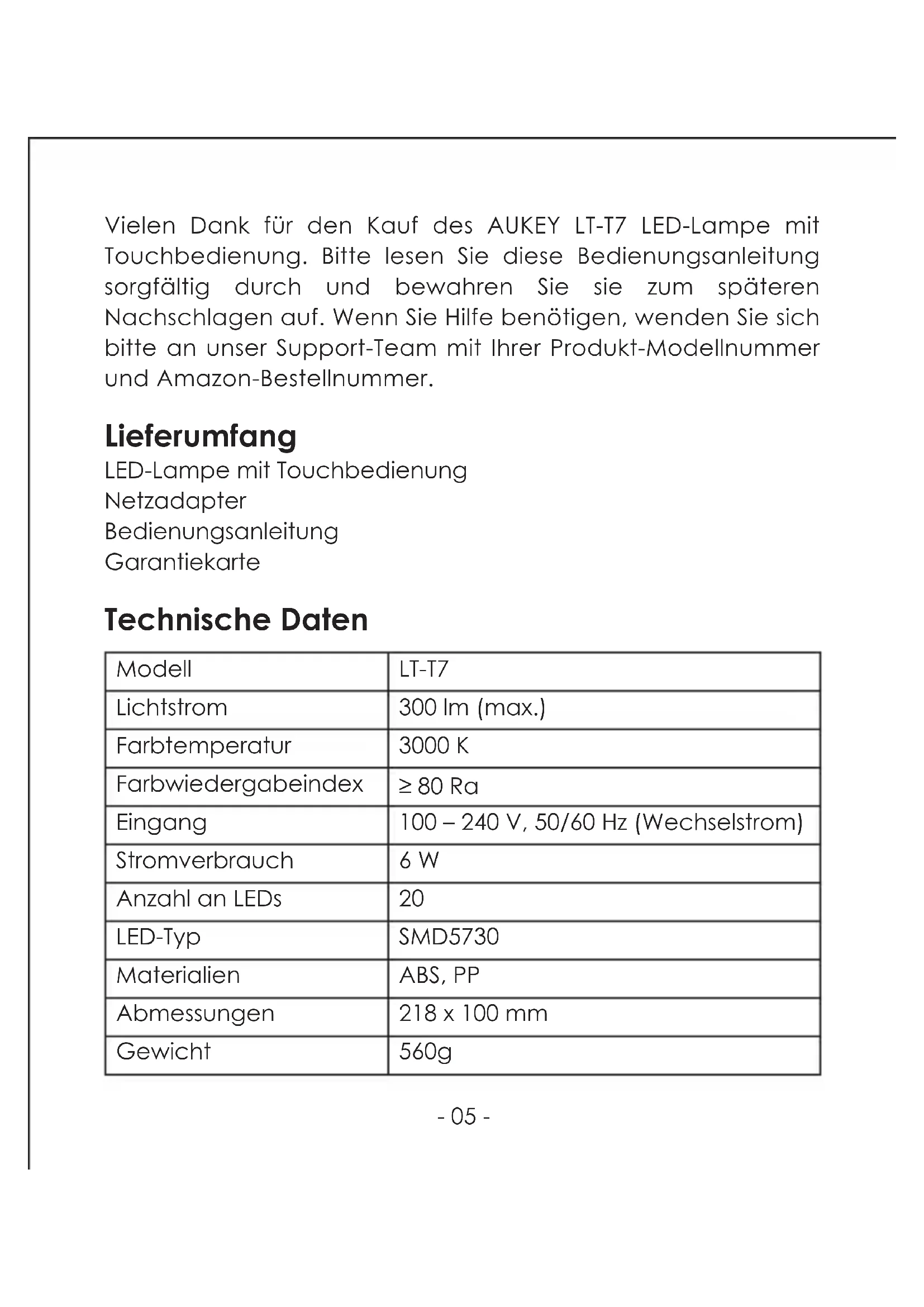 Vielen Dank für den Kauf des AUKEY LT-T7 LED-Lampe mit Touchbedienung.itte lessen Sie diese Bedienungsanleitung sorgfältig durch und bewahren Sie sie zum späteren Nachschlagen auf. Wenn Sie Hilfe benötigen, wenden Sie sichitte an unser Support-Team mit ihrer Produkt-Modellnummer und Amazon-Bestellnummer.