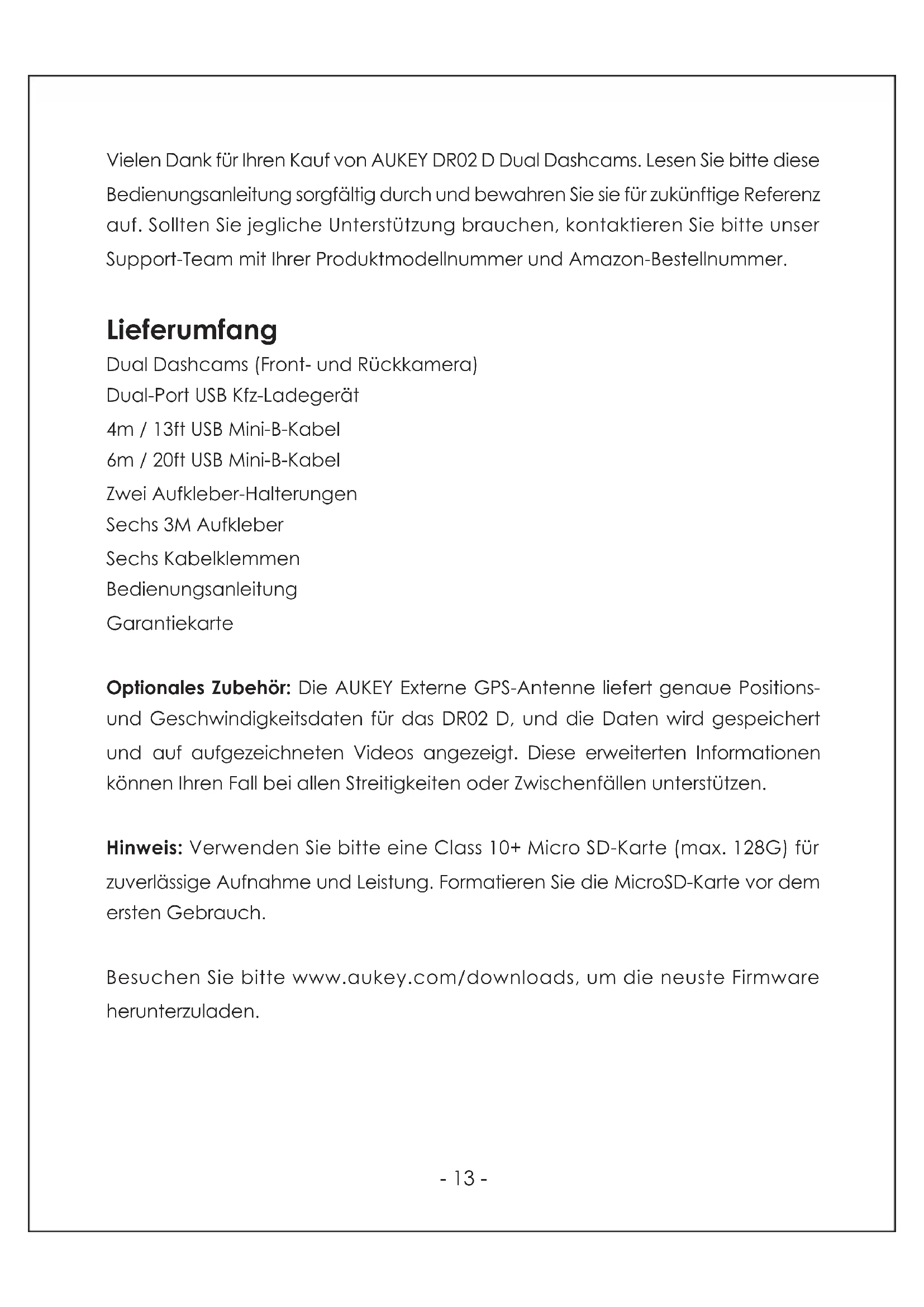 Deleting and Locking/Unlocking Photos and Videos ● Press to delete or to lock/unlock a photo or video file after selecting it from the playlist. If a video is being played, press to stop it and then press to delete or to lock/unlock ● Once deleted, photos and videos can’t be recovered ● If you lock a photo or video, it will be protected and not overwritten Product Care & Use ● Ensure camera and mount are firmly fixed in place before use to avoid falls ● Keep away from liquids, extreme heat, and strong magnetic fields ● Avoid touching the lens surface. It may be cleaned with a cotton swab or lens cleaning paper. If any dirt is difficult to remove, a non-abrasive glasses lens cleaner may be used. Don’t use corrosive solutions ● Keep important videos and photos backed up elsewhere to protect against file corruption or loss caused by any SD card issues Warranty & Customer Support For questions, support, or warranty claims, please contact us at the address below that corresponds with your region. Please include your Amazon order number and product model number. Amazon US orders: support.us@aukey.com Amazon EU orders: support.eu@aukey.com Amazon CA orders: support.ca@aukey.com Amazon JP orders: support.jp@aukey.com *Please note, AUKEY can only provide after sales service for products purchased directly from AUKEY. If you have purchased from a different seller, please contact them directly for service or warranty issues.- 13 - Vielen Dank für Ihren Kauf von AUKEY DR02 D Dual Dashcams. Lesen Sie bitte diese Bedienungsanleitung sorgfältig durch und bewahren Sie sie für zukünftige Referenz auf. Sollten Sie jegliche Unterstützung brauchen, kontaktieren Sie bitte unser Support-Team mit Ihrer Produktmodellnummer und Amazon-Bestellnummer. Lieferumfang Dual Dashcams (Front- und Rückkamera) Dual-Port USB Kfz-Ladegerät 4m / 13ft USB Mini-B-Kabel 6m / 20ft USB Mini-B-Kabel Zwei Aufkleber-Halterungen Sechs 3M Aufkleber Sechs Kabelklemmen Bedienungsanleitung Garantiekarte Optionales Zubehör: Die AUKEY Externe GPS-Antenne liefert genaue Positions- und Geschwindigkeitsdaten für das DR02 D, und die Daten wird gespeichert und auf aufgezeichneten Videos angezeigt. Diese erweiterten Informationen können Ihren Fall bei allen Streitigkeiten oder Zwischenfällen unterstützen. Hinweis: Verwenden Sie bitte eine Class 10+ Micro SD-Karte (max. 128G) für zuverlässige Aufnahme und Leistung. Formatieren Sie die MicroSD-Karte vor dem ersten Gebrauch. Besuchen Sie bitte www.aukey.com/downloads, um die neuste Firmware herunterzuladen.- 14 - Produkt-Diagramm Frontkamera USB Mini-B Port GPS-Eingang USB Mini-B AV-Eingang Befestigungsplatte Objektiv Mikrofon Äußere LED-Anzeige Zurücksetzen-Taste MicroSD-Karte-Slot- 15 - 1080P+1080P 00:01:14 2049/08/13 22:15:06 Display Steuertasten Innere LED-Anzeige Bildschirmanzeige USB Mini-B AV-Ausgang Äußere LED-Anzeige Objektiv Befestigungsplatte Rückkamera- 16 - Spezifikationen Modell Bildsensor CPU Display Weitwinkel-Objektiv Irisblende Belichtungswert Aufnahme-Auflösungen Bildformat Sound-Aufnahme Aufnahmemodi Sensitivität des G-Sensors Micro SD-Karte Eingang Betriebstemperatur Materialien Abmessungen DR02 D Sony Exmor IMX323 2,3 Megapixel CMOS Sensor NT96663 1,5" LCD Frontkamera: 170° Rückkamera: 152° Frontkamera: f/1,8 Rückkamera: f/2,0 -1,0, -2/3, -1/3, +0,0, +1/3, +2/3, +1,0 Dual Kameras: 1080p (30fps) Nur Frontkamera: 1080p (30fps), 720p (60fps), 720p (30fps), WVGA, VGA JPEG Ein / Aus Loop, Bewegungserkennung, Zeitraffer, Notaufnahme Niedrig / Mittel / Höhe Class 10 oder höher, 128GB Max DC 5V 1A-2A -30°C – 75°C (-22°F – 167°F) ABS, PC, Glas Frontkamera: 77 x 51 x 37mm / 3” x 2” x 1,45” Rückkamera: 54 x 50 x 28mm / 2,1” x 2” x 1,1”- 17 - System-LED-Anzeige Es gibt insgesamt vier Indikatoren. Jede Kamera hat eine LED-Anzeige, die nach außen zeigt (damit andere wissen, dass Ihre Kamera aktiv ist). Die Frontkamera hat eine LED-Anzeige, die nach innen zeigt und eine On-Screen-Anzeige (beide für Ihre Referenz). Äußere LED-Anzeige beider Kameras können ausgeschaltet werden. Falls Sie wollen, dass das Dashcam-System für die Menschen draußen nicht sichtbar ist. Treten Sie zu Setup ein > Detect Led > wählen Sie Off > drücken Sie OK. Äußere LED-Anzeige Grün Grün blinkt Innere LED-Anzeige Grün Grün blinkt Screen Indicator Aus Rot blinkt Bedeutung Auf; Nicht aufnahmen Auf; Aufnahmen Hinweis: Im Bewegungserkennung-Modus ist nur die inner LED im Standby. Sobald die Bewegung erkannt wird, funktionieren alle Indikatoren wie die normale Aufnahme. Taste Aufnahmemodus In den Notaufnahme- Modus gehen Playlist ansehen (kurz drücken) Audio-Aufnahme ein/ ausschalten (lang drücken) Setup-Menü öffnen (kurz drücken) Snapshot erstellen (lang drücken) Playlist & Setup-Menü Zurück zum vorherigen Menü Nach oben Nach unten Wiedergabe -Modus Zurück zum Playlist / Stop Löschen / Rücklauf Sperren & Entsperren / Schnell-Vorlauf Steuertasten- 18 - Bildschirmansicht umschalten und Display ein/ausschalten Enter / Bestätigen Play / Pause Zurücksetzen- Taste Drücken diese Taste kurz, um das Gerät zurückzusetzen und neu zu starten (Dies wirkt sich nicht auf gespeicherte Dateien aus) Hinweis: Bevor zum Playlist oder Einstellungsmenü eintreten, gibt es eine kurze Pause, um aktuelle Aufnahme zu speichern Es gibt 3 Optionen von Bildschirmansicht - Dual-View, Frontkamera und Rückkamera. Wenn die Dashcam eingeschaltet ist, drücken Sie OK-Taste, um die Bildschirmansicht zu wechseln und den Bildschirm (Die Aufnahme wird fortgesetzt) auszuschalten. Sie können auch das ”Screen Saver” einstellen, um den Bildschirm nach 1 oder 3 Minuten automatisch auszuschalten. Benutzung der Micro SD-Karte Die Kamera erhält keinen internen Speicher und erfordert eine MicroSD-Karte (Class 10+ wird empfohlen, und bis zu max. 128GB unterstützt) zum Funktionieren. Eine 128GB-Micro SD-Karte kann 20 Stunden mit 1080p Aufnahmen speichern. Verwenden Si