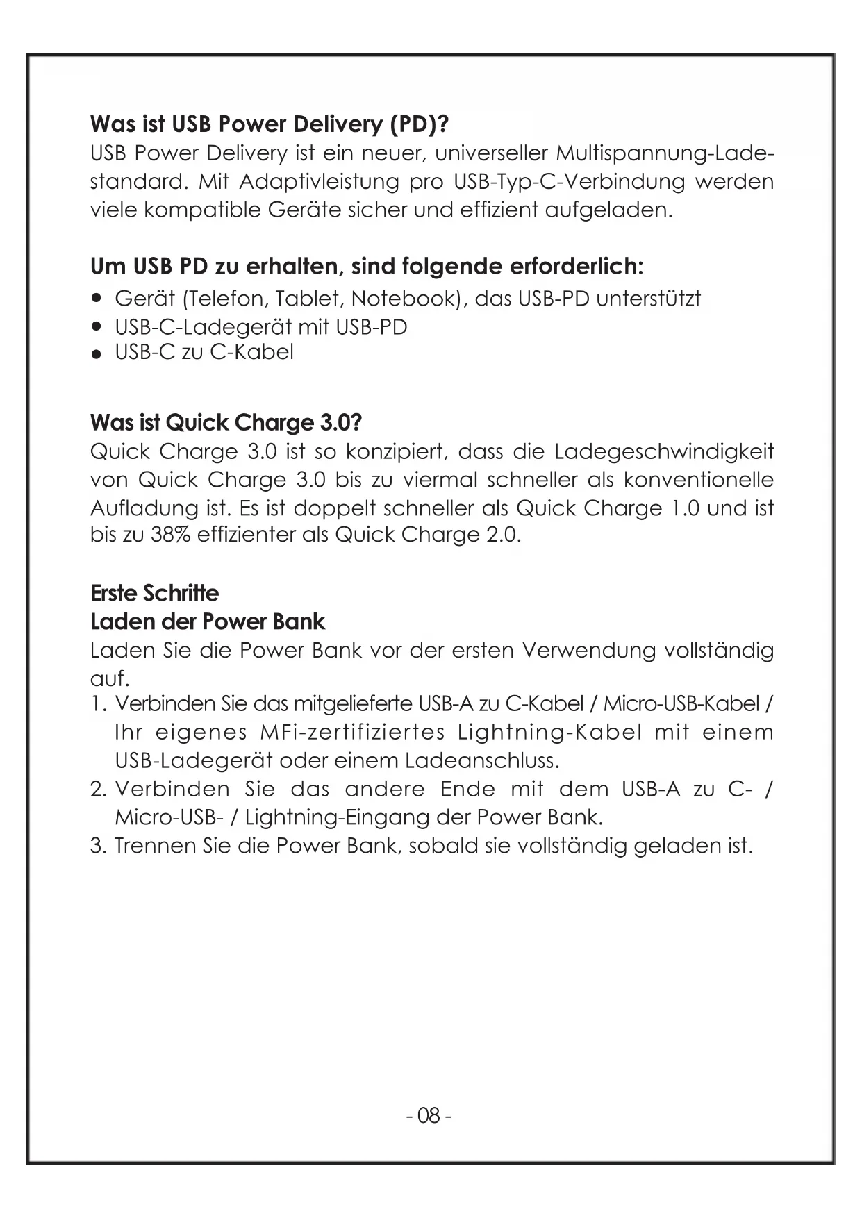 Was ist Quick Charge 3.0? Quick Charge 3.0 ist so konzipiert, dass die Ladegeschwindigkeit von Quick Charge 3.0 bis zu viermal schneller als konventionelle Aufladung ist. Es ist doppelt schneller als Quick Charge 1.0 und ist bis zu 38% effizienter als Quick Charge 2.0. Erste Schritte Laden der Power Bank Laden Sie die Power Bank vor der ersten Verwendung vollständig auf. Was ist USB Power Delivery (PD)? USB Power Delivery ist ein neuer, universeller Multispannung-Lade- standard. Mit Adaptivleistung pro USB-Typ-C-Verbindung werden viele kompatible Geräte sicher und effizient aufgeladen. Um USB PD zu erhalten, sind folgende erforderlich: Gerät (Telefon, Tablet, Notebook), das USB-PD unterstützt USB-C-Ladegerät mit USB-PD USB-C zu C-Kabel Verbinden Sie das mitgelieferte USB-A zu C-Kabel / Micro-USB-Kabel / Ihr eigenes MFi-zertifiziertes Lightning-Kabel mit einem USB-Ladegerät oder einem Ladeanschluss. Verbinden Sie das andere Ende mit dem USB-A zu C- / Micro-USB- / Lightning-Eingang der Power Bank. Trennen Sie die Power Bank, sobald sie vollständig geladen ist.