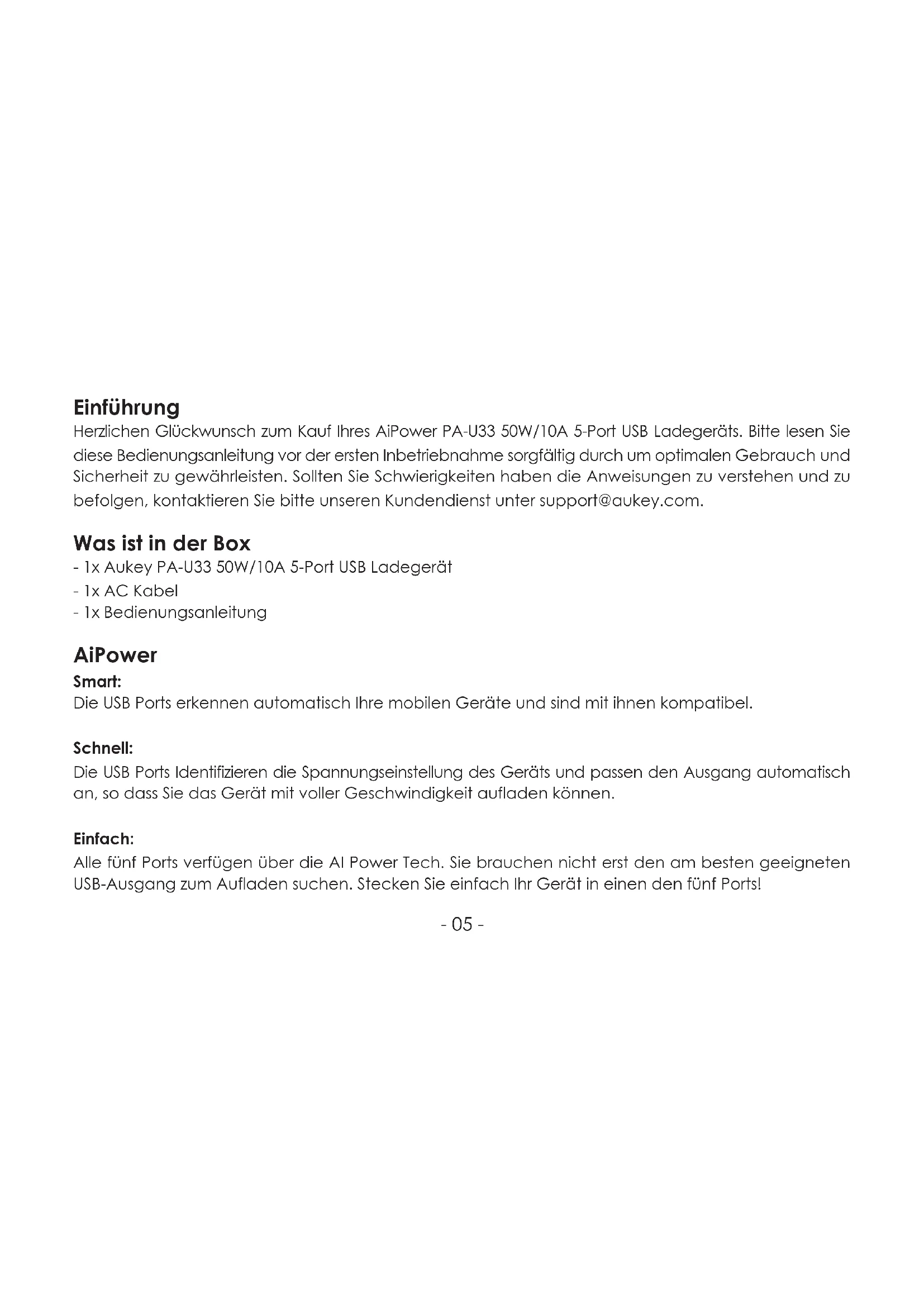 Herzlichen Glückwunsch zum Kauf Ihr's AiPower PA-U33 50W/10A 5-Port USB Ladegerats.itte lessen Sie.