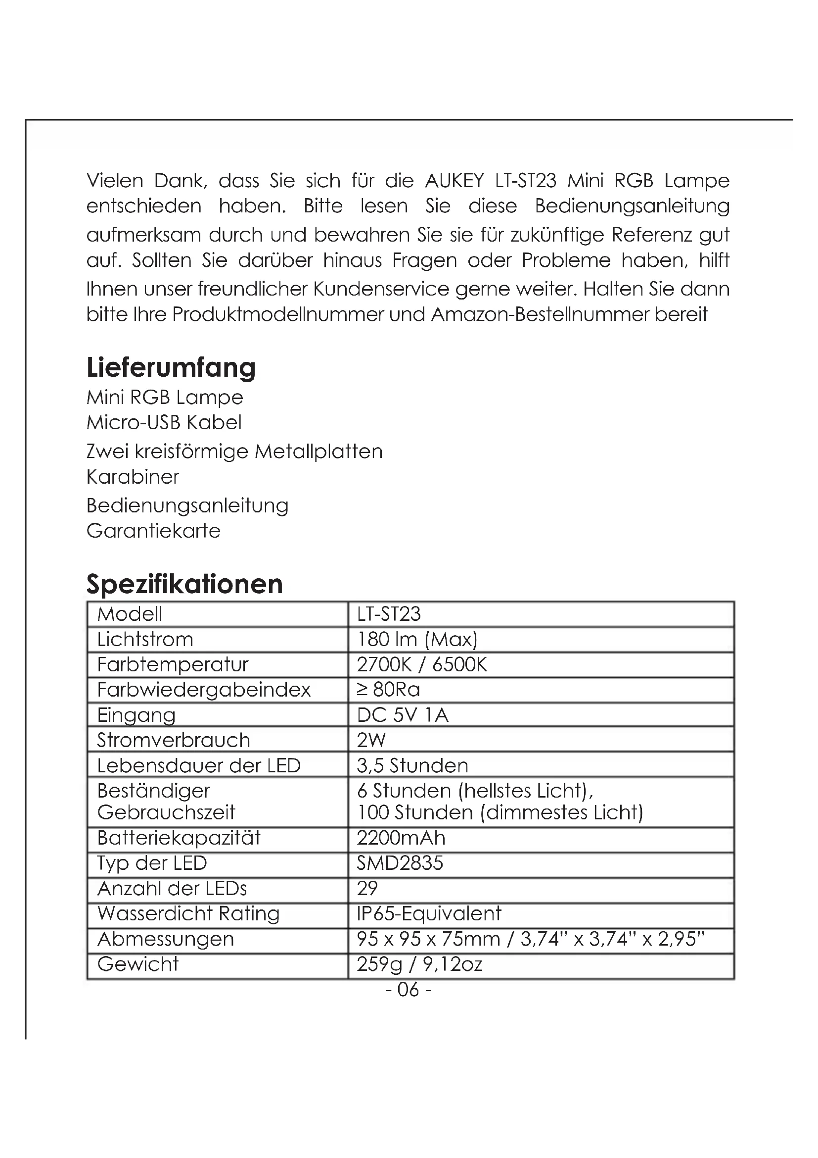 ●- 05 - Warranty & Customer Support For questions, support, or warranty claims, contact us at the address below that corresponds with your region. Please include your Amazon order number and product model number. Amazon US orders: support.us@aukey.com Amazon EU orders: support.eu@aukey.com Amazon CA orders: support.ca@aukey.com Amazon JP orders: support.jp@aukey.com *Please note, AUKEY can only provide after sales service for products purchased directly from AUKEY. If you have purchased from a different seller, please contact them directly for service or warranty issues.- 06 - Vielen Dank, dass Sie sich für die AUKEY LT-ST23 Mini RGB Lampe entschieden haben. Bitte lesen Sie diese Bedienungsanleitung aufmerksam durch und bewahren Sie sie für zukünftige Referenz gut auf. Sollten Sie darüber hinaus Fragen oder Probleme haben, hilft Ihnen unser freundlicher Kundenservice gerne weiter. Halten Sie dann bitte Ihre Produktmodellnummer und Amazon-Bestellnummer bereit Lieferumfang Mini RGB Lampe Micro-USB Kabel Zwei kreisförmige Metallplatten Karabiner Bedienungsanleitung Garantiekarte Spezifikationen Modell Lichtstrom Farbtemperatur Farbwiedergabeindex Eingang Stromverbrauch Lebensdauer der LED Batteriekapazität Typ der LED Anzahl der LEDs Wasserdicht Rating Abmessungen Gewicht 2200mAh SMD2835