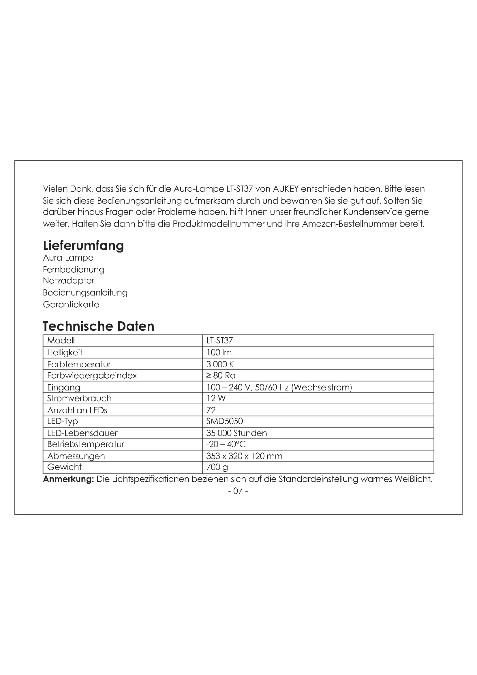 Product Care & Use Warranty & Customer Support For questions, support, or warranty claims, contact us at the address below that corresponds with your region. Please include your Amazon order number and product model number. Amazon US orders: support.us@aukey.com Amazon EU orders: support.eu@aukey.com Amazon CA orders: support.ca@aukey.com Amazon JP orders: support.jp@aukey.com *Please note, AUKEY can only provide after sales service for products purchased directly from AUKEY. If you have purchased from a different seller, please contact them directly for service or warranty issues.- 07 - Vielen Dank, dass Sie sich für die Aura-Lampe LT-ST37 von AUKEY entschieden haben. Bitte lesen Sie sich diese Bedienungsanleitung aufmerksam durch und bewahren Sie sie gut auf. Sollten Sie darüber hinaus Fragen oder Probleme haben, hilft Ihnen unser freundlicher Kundenservice gerne weiter. Halten Sie dann bitte die Produktmodellnummer und Ihre Amazon-Bestellnummer bereit. Lieferumfang Aura-Lampe Fernbedienung Netzadapter Bedienungsanleitung Garantiekarte Technische Daten Modell Helligkeit Farbtemperatur Farbwiedergabeindex Eingang Stromverbrauch Anzahl an LEDs LED-Typ LED-Lebensdauer Betriebstemperatur Abmessungen Gewicht LT-ST37 100 lm 3 000 K ≥ 80 Ra 100 – 240 V, 50/60 Hz (Wechselstrom) 12 W