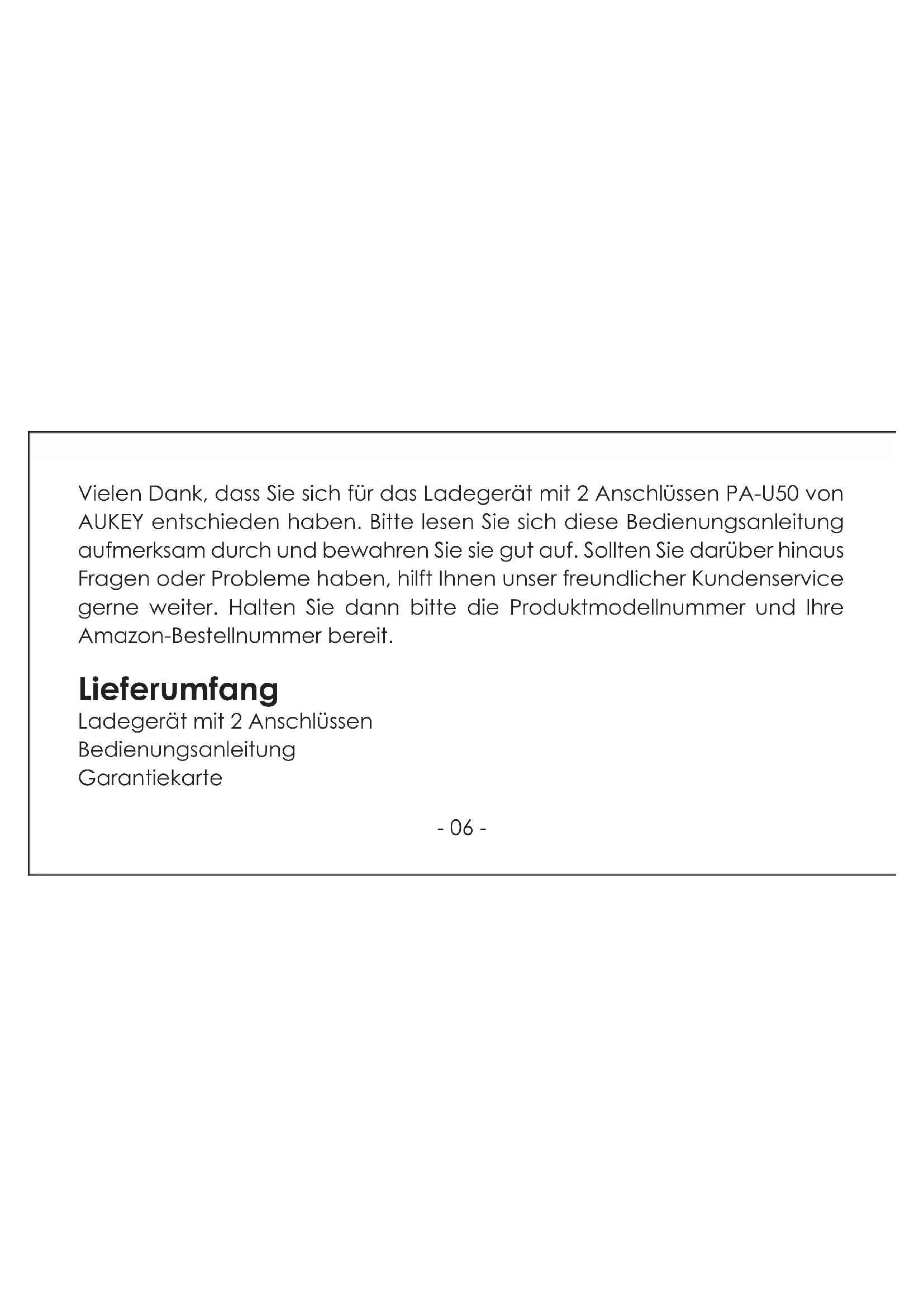 Vielen Dank, dass Sie sich für das Ladegerät mit 2 Anschlüssen PA-U50 von AUKEY entschieden haben.itte lessen Sie sich diese Bedienungsanleitung aufmerksam durch und bewahren Sie sie gut auf. Sollten Sie darüber hinaus Fragen oder Probleme haben, hilft Ihnen unser freundlicher Kundenservice和地区更为。Halten Sie dannitte die Produktmodellnummer und ihre Amazon-Bestellnummer bereit.
