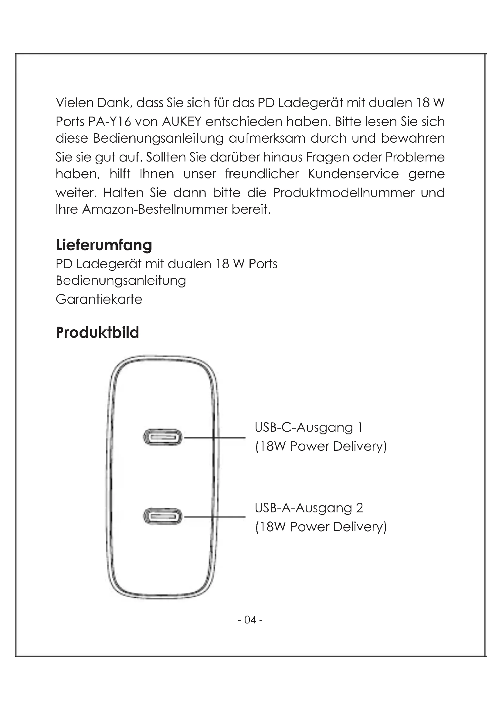 - Please note, AUKEY can only provide after sales service for products purchased directly from AUKEY. If you have purchased from a different seller, please contact them directly for service or warranty issues.- 04 - Vielen Dank, dass Sie sich für das PD Ladegerät mit dualen 18 W Ports PA-Y16 von AUKEY entschieden haben. Bitte lesen Sie sich diese Bedienungsanleitung aufmerksam durch und bewahren Sie sie gut auf. Sollten Sie darüber hinaus Fragen oder Probleme haben, hilft Ihnen unser freundlicher Kundenservice gerne weiter. Halten Sie dann bitte die Produktmodellnummer und Ihre Amazon-Bestellnummer bereit. Lieferumfang PD Ladegerät mit dualen 18 W Ports Bedienungsanleitung Garantiekarte Produktbild USB-C-Ausgang 1 (18W Power Delivery) USB-A-Ausgang 2 (18W Power Delivery)- 05 - Technische Daten Hinweis: Dieses Ladegerät unterstützt die gleichzeitige Ausgang- sleistung bis zu 18 W von jeden beiden Ports (36 W insgesamt) Was ist Power Delivery? USB Power Delivery ist ein neuer, universeller mehrspannungsfähiger Ladestandard, der die Energieausgabe über eine USB-C- Verbindung dynamisch reguliert, um möglichst viele Geräte sicher und effizient zu laden. Voraussetzungen zur USB-PD-Nutzung: Gerät (Smartphone, Tablet, Laptop), das USB-PD unterstützt USB-C-Ladegerät mit USB-PD USB-C- zu C-Kabel Modell Technologie Eingang PA-Y16 Power Delivery 3.0 AC 100–240 V Ausgang 1/2 Gesamtleistung Abmessungen Gewicht 36 W 64 x 63 x 29 mm / 2,52” x 2,48” x 1,14” 106 g / 3,74 oz