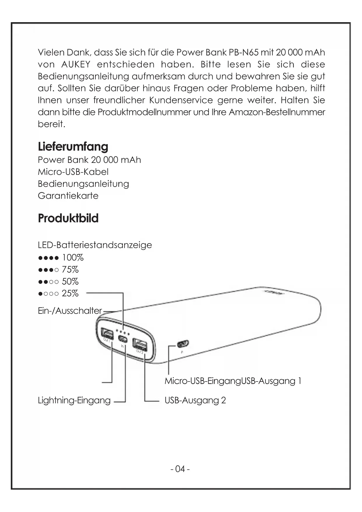Keep away from liquids and extreme heat Don’t charge your devices while recharging the power bank Recharge the PB-N65 at least once every 3 months Dispose of battery according to local environmental law Low-Current Charging Mode This mode is customized to charge low-current devices (below 60mA). Try switching to this mode if a low-powered device (such as a fitness tracker or wireless headphones) isn’t charged in the standard charging mode. Product Care & UseVielen Dank, dass Sie sich für die Power Bank PB-N65 mit 20 000 mAh von AUKEY entschieden haben. Bitte lesen Sie sich diese Bedienungsanleitung aufmerksam durch und bewahren Sie sie gut auf. Sollten Sie darüber hinaus Fragen oder Probleme haben, hilft Ihnen unser freundlicher Kundenservice gerne weiter. Halten Sie dann bitte die Produktmodellnummer und Ihre Amazon-Bestellnummer bereit. Lieferumfang Power Bank 20 000 mAh Micro-USB-Kabel Bedienungsanleitung Garantiekarte Produktbild