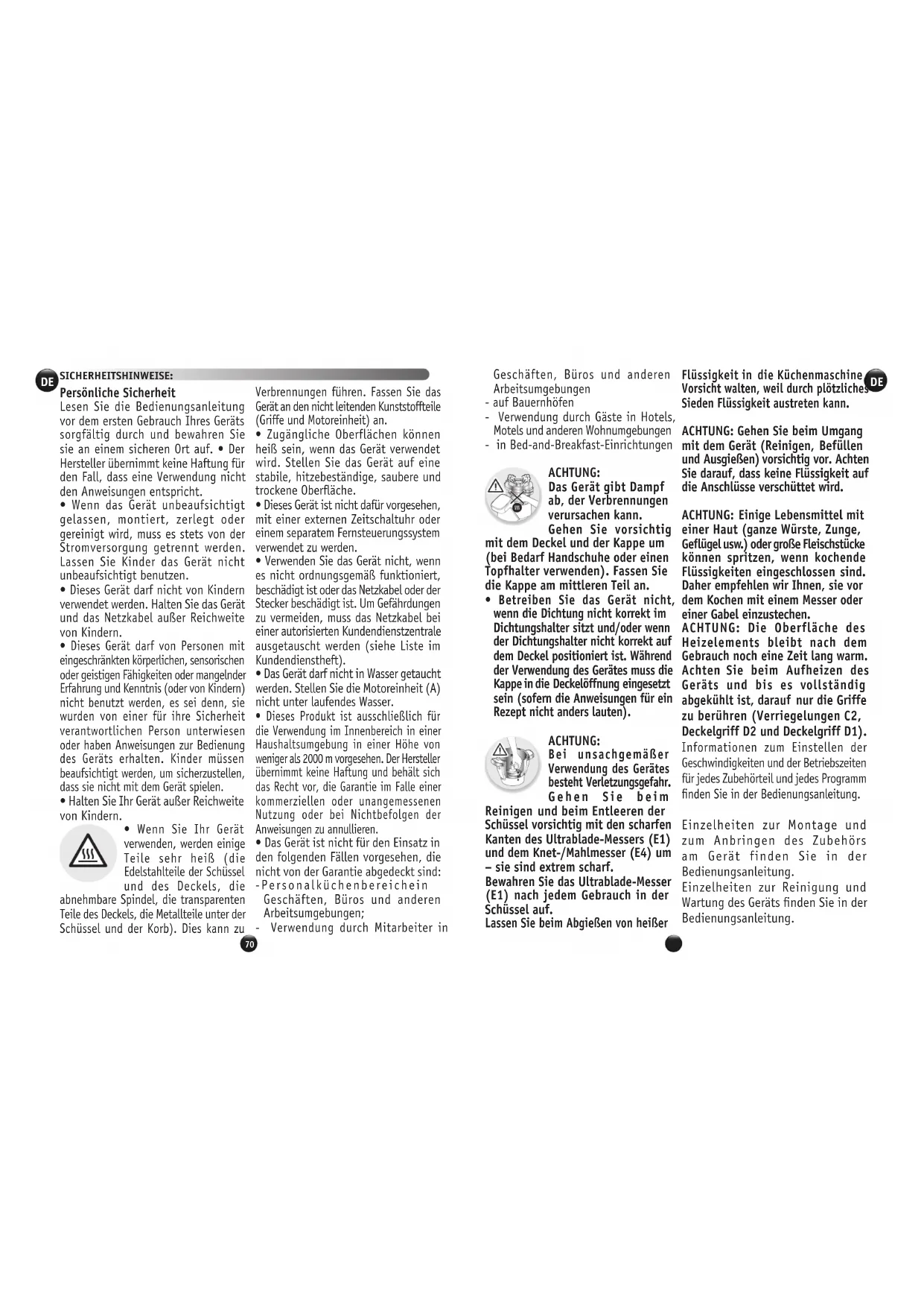- Betreiben Sie das Gerät nicht, wenn die Dichtung nicht korrekt im Dichtungshalter sitzt und/oder wenn der Dichtungshalter nicht korrekt auf dem Deckel positioniert ist. Während der Verwendung des Gerätes muss die Kappe in die Deckelöffnung eingesetzt sein (sofern die Anweisungen für ein Rezept nicht anders lauten). ACHTUNG: Bei unsachgemäßer Verwendung des Gerätes besteht Verletzungsgefahr. Gehen Sie beim Reinigen und beim Entleeren der Schüssel vorsichtig mit den scharfen Kanten des Ultrablade-Messers (E1) und dem Knet-/Mahlmesser (E4) um – sie sind extrem scharf. Bewahren Sie das Ultrablade-Messer (E1) nach jedem Gebrauch in der Schüssel auf. Lassen Sie beim Abgießen von heißer Flüssigkeit in die Küchenmaschine Vorsicht walten, weil durch plötzliches Sieden Flüssigkeit austreten kann. ACHTUNG: Gehen Sie beim Umgang mit dem Gerät (Reinigen, Befüllen und Ausgießen) vorsichtig vor. Achten Sie darauf, dass keine Flüssigkeit auf die Anschlüsse verschüttet wird. ACHTUNG: Einige Lebensmittel mit einer Haut (ganze Würste, Zunge, Geflügel usw.) oder große Fleischstücke können spritzen, wenn kochende Flüssigkeiten eingeschlossen sind. Daher empfehlen wir Ihnen, sie vor dem Kochen mit einem Messer oder einer Gabel einzustechen. ACHTUNG: Die Oberfläche des Heizelements bleibt nach dem Gebrauch noch eine Zeit lang warm. Achten Sie beim Aufheizen des Geräts und bis es vollständig abgekühlt ist, darauf nur die Griffe zu berühren (Verriegelungen C2, Deckelgriff D2 und Deckelgriff D1). Informationen zum Einstellen der Geschwindigkeiten und der Betriebszeiten für jedes Zubehörteil und jedes Programm finden Sie in der Bedienungsanleitung. Einzelheiten zur Montage und zum Anbringen des Zubehörs am Gerät finden Sie in der Bedienungsanleitung. Einzelheiten zur Reinigung und Wartung des Geräts finden Sie in der Bedienungsanleitung.72 73 DEDE Befolgen Sie zum Reinigen des Geräts stets die Reinigungsanweisungen.