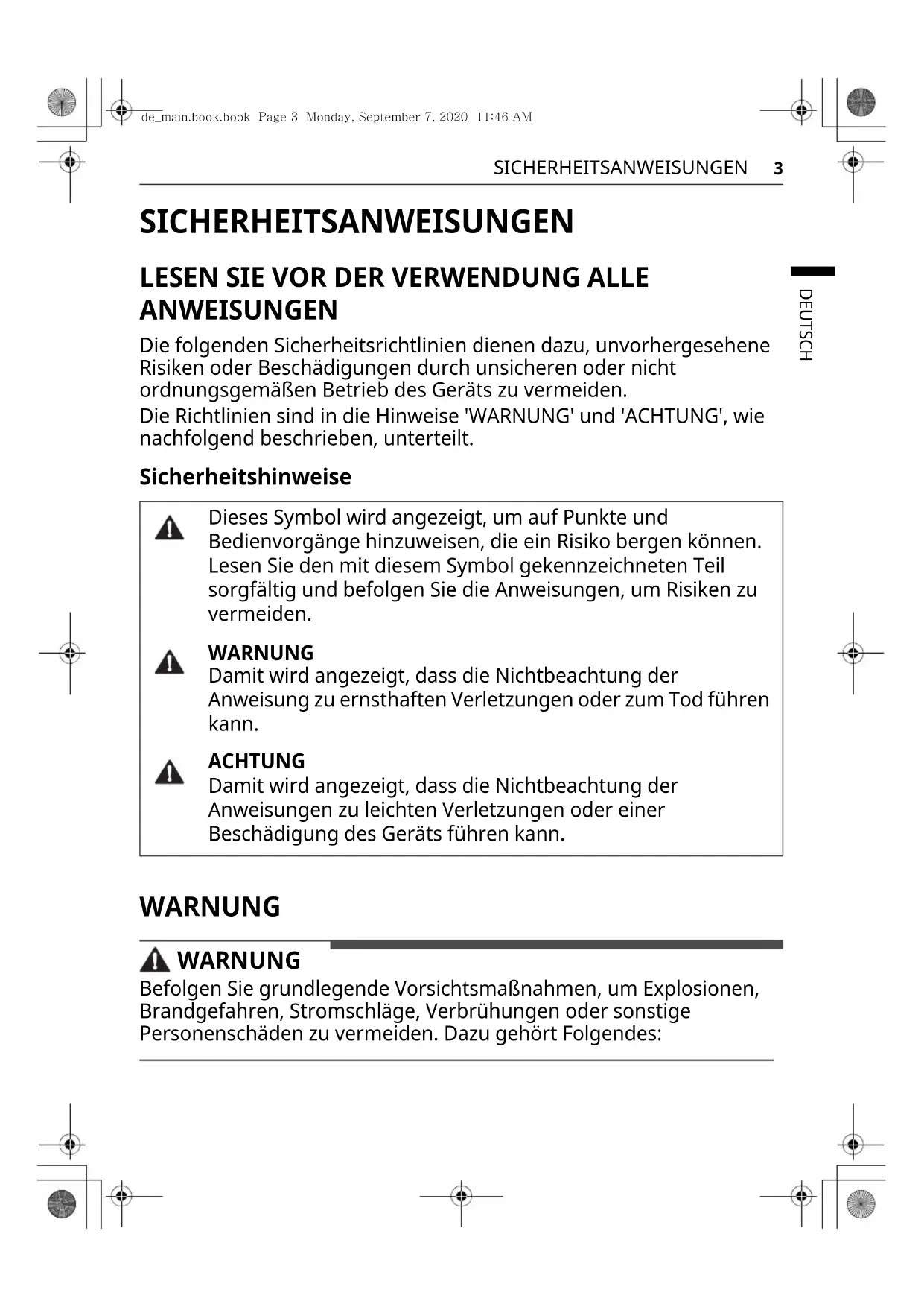 ANWEISUNGEN Die folgenden Sicherheitsrichtlinien dienen dazu, unvorhergesehene Risiken oder Beschädigungen durch unsicheren oder nicht ordnungsgemäßen Betrieb des Geräts zu vermeiden. Die Richtlinien sind in die Hinweise 'WARNUNG' und 'ACHTUNG', wie nachfolgend beschrieben, unterteilt. Sicherheitshinweise WARNUNG WARNUNG Befolgen Sie grundlegende Vorsichtsmaßnahmen, um Explosionen, Brandgefahren, Stromschläge, Verbrühungen oder sonstige Personenschäden zu vermeiden. Dazu gehört Folgendes: Dieses Symbol wird angezeigt, um auf Punkte und Bedienvorgänge hinzuweisen, die ein Risiko bergen können. Lesen Sie den mit diesem Symbol gekennzeichneten Teil sorgfältig und befolgen Sie die Anweisungen, um Risiken zu vermeiden. WARNUNG Damit wird angezeigt, dass die Nichtbeachtung der Anweisung zu ernsthaften Verletzungen oder zum Tod führen kann. ACHTUNG Damit wird angezeigt, dass die Nichtbeachtung der Anweisungen zu leichten Verletzungen oder einer Beschädigung des Geräts führen kann. de_main.book.book Page 3 Monday, September 7, 2020 11:46 AM4 SICHERHEITSANWEISUNGEN Technische Sicherheit