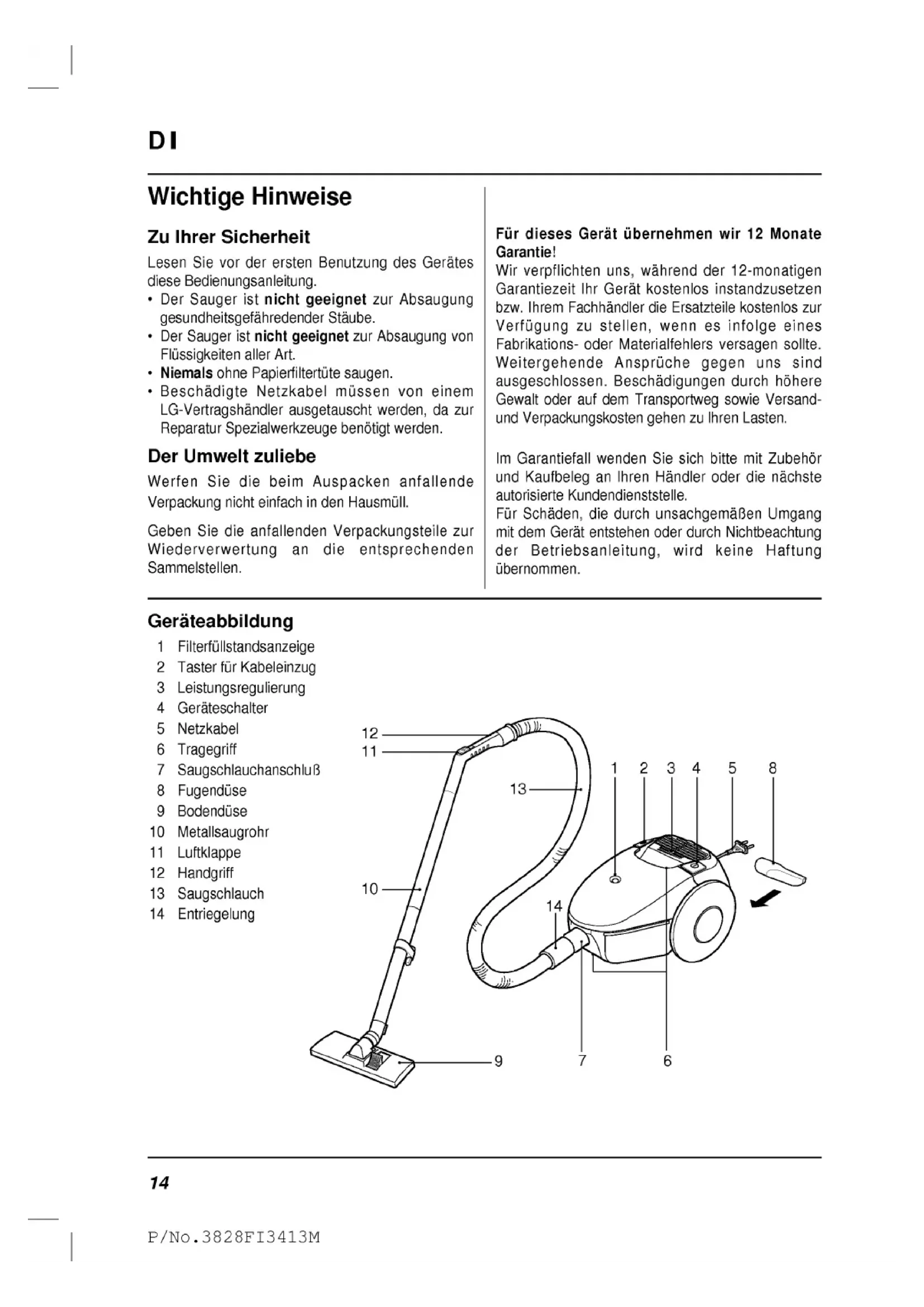 Weitergehende Anspruche sind ausgeschlossen! SolltenTeiledieser Bestimmungen unwirksamsein,so gelten sie sinngemaß. DieWirksamkeitderu brigen Bestimmungen wirdhiervonnichtberuhrt. Garantiebedingungen fur StaubsaugerP/No.: 3828Fi3413M