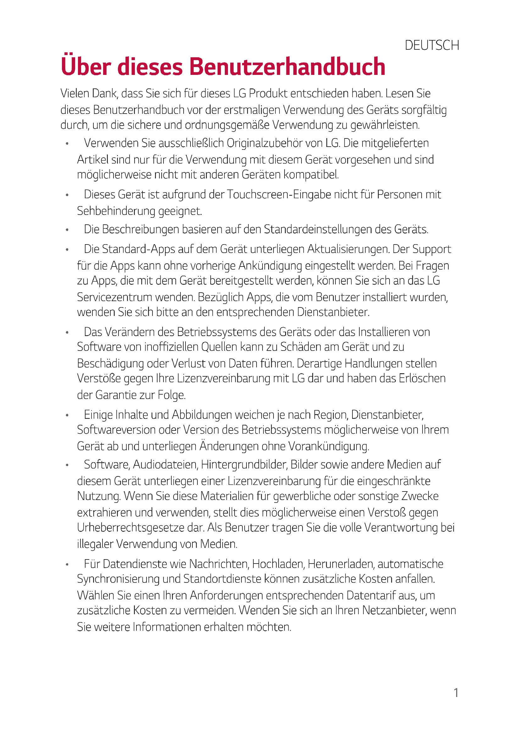 accumulateurs, veuillez contacter votre mairie, le service des ordures ménagères ou encore le magasin où vous avez acheté ce produit.1 Über dieses Benutzerhandbuch Vielen Dank, dass Sie sich für dieses LG Produkt entschieden haben. Lesen Sie dieses Benutzerhandbuch vor der erstmaligen Verwendung des Geräts sorgfältig durch, um die sichere und ordnungsgemäße Verwendung zu gewährleisten.