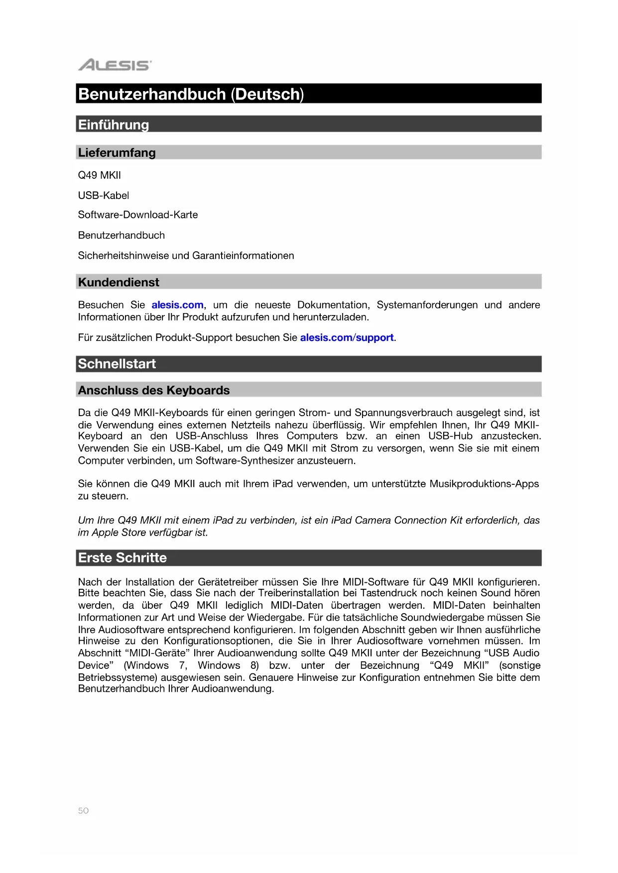 OUT verso qualsiasi periferica connessa. Per utilizzare l’uscita MIDI, selezionare Q49 MKII USB MIDI Out come dispositivo MIDI di uscita nel sequencer.50 Benutzerhandbuch (Deutsch) Einführung Lieferumfang Q49 MKII USB-Kabel Software-Download-Karte Benutzerhandbuch Sicherheitshinweise und Garantieinformationen Kundendienst Besuchen Sie alesis.com, um die neueste Dokumentation, Systemanforderungen und andere Informationen über Ihr Produkt aufzurufen und herunterzuladen. Für zusätzlichen Produkt-Support besuchen Sie alesis.com/support. Schnellstart Anschluss des Keyboards Da die Q49 MKII-Keyboards für einen geringen Strom- und Spannungsverbrauch ausgelegt sind, ist die Verwendung eines externen Netzteils nahezu überflüssig. Wir empfehlen Ihnen, Ihr Q49 MKII- Keyboard an den USB-Anschluss Ihres Computers bzw. an einen USB-Hub anzustecken. Verwenden Sie ein USB-Kabel, um die Q49 MKII mit Strom zu versorgen, wenn Sie sie mit einem Computer verbinden, um Software-Synthesizer anzusteuern. Sie können die Q49 MKII auch mit Ihrem iPad verwenden, um unterstützte Musikproduktions-Apps zu steuern. Um Ihre Q49 MKII mit einem iPad zu verbinden, ist ein iPad Camera Connection Kit erforderlich, das im Apple Store verfügbar ist. Erste Schritte Nach der Installation der Gerätetreiber müssen Sie Ihre MIDI-Software für Q49 MKII konfigurieren. Bitte beachten Sie, dass Sie nach der Treiberinstallation bei Tastendruck noch keinen Sound hören werden, da über Q49 MKII lediglich MIDI-Daten übertragen werden. MIDI-Daten beinhalten Informationen zur Art und Weise der Wiedergabe. Für die tatsächliche Soundwiedergabe müssen Sie Ihre Audiosoftware entsprechend konfigurieren. Im folgenden Abschnitt geben wir Ihnen ausführliche Hinweise zu den Konfigurationsoptionen, die Sie in Ihrer Audiosoftware vornehmen müssen. Im Abschnitt “MIDI-Geräte” Ihrer Audioanwendung sollte Q49 MKII unter der Bezeichnung “USB Audio Device” (Windows 7, Windows 8) bzw. unter der Bezeichnung “Q49 MKII” (sonstige Betriebssysteme) ausgewiesen sein. Genauere Hinweise zur Konfiguration entnehmen Sie bitte dem Benutzerhandbuch Ihrer Audioanwendung.51 Setup Teile, die nicht unter Einführung > Lieferumfang angegeben sind, sind separat erhältlich.