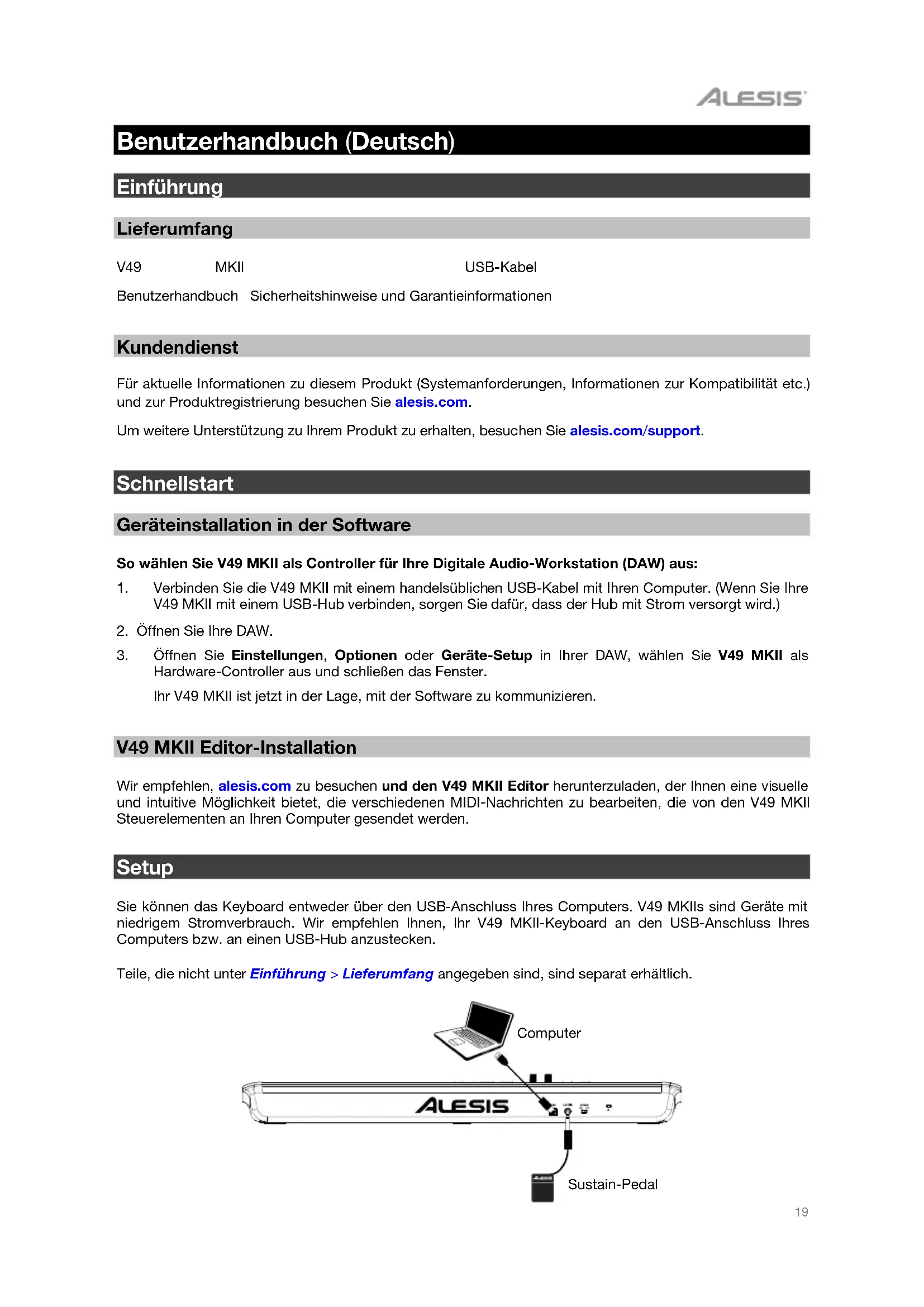 : questo connettore è compatibile con cavi di sicurezza Kensington standard per computer per la protezione contro i furti.19 Benutzerhandbuch (Deutsch) Einführung Lieferumfang V49 MKII USB-Kabel Software-Download-Karte Benutzerhandbuch Sicherheitshinweise und Garantieinformationen Kundendienst Für aktuelle Informationen zu diesem Produkt (Systemanforderungen, Informationen zur Kompatibilität etc.) und zur Produktregistrierung besuchen Sie alesis.com. Um weitere Unterstützung zu Ihrem Produkt zu erhalten, besuchen Sie alesis.com/support. Schnellstart Geräteinstallation in der Software So wählen Sie V49 MKII als Controller für Ihre Digitale Audio-Workstation (DAW) aus: