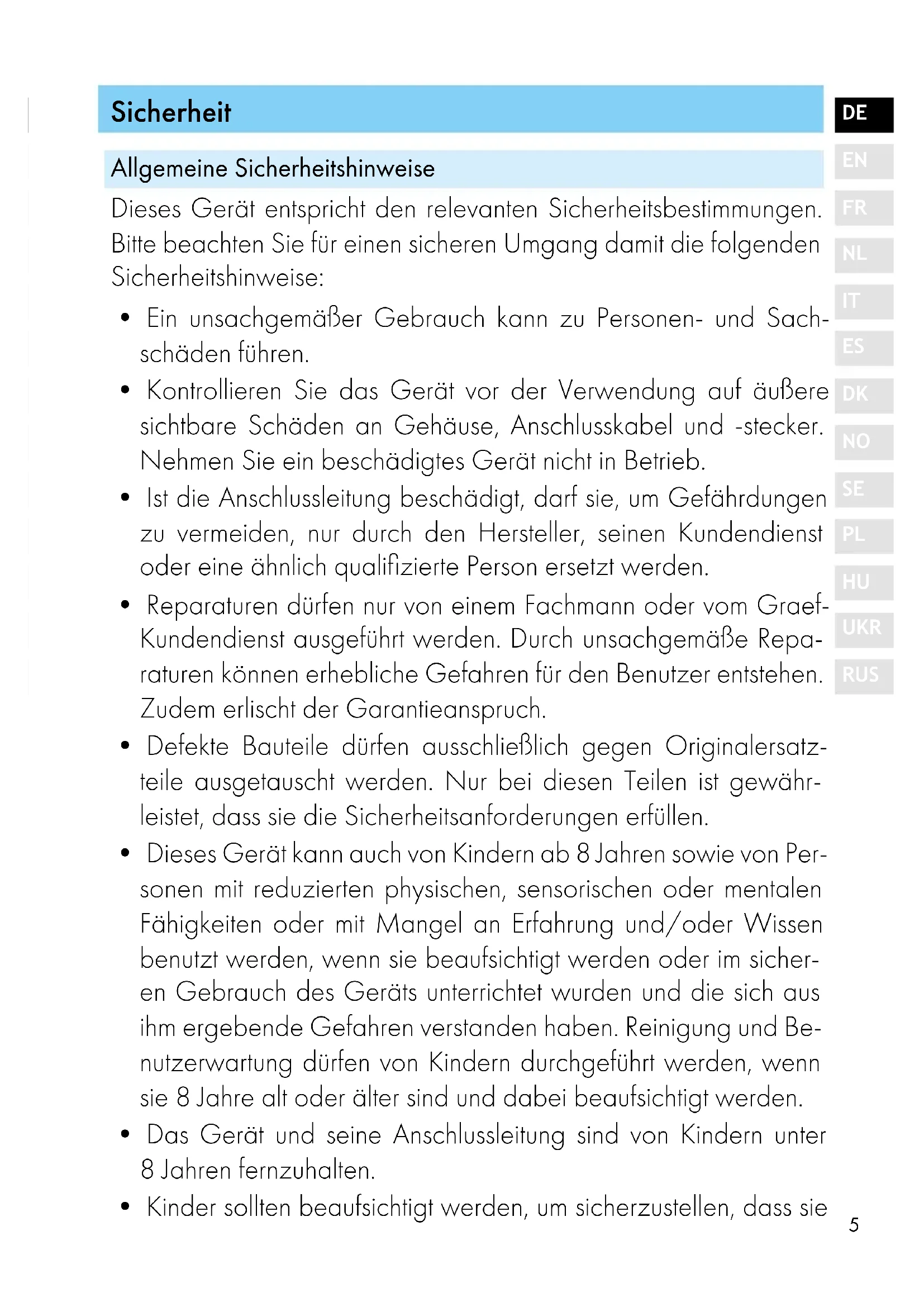 - Reparaturen dürfen nur von einem Fachmann oder vom Graef- Kundendienst ausgeführt werden. Durch unsachgemäße Repa- raturen können erhebliche Gefahren für den Benutzer entstehen. Zudem erlischt der Garantieanspruch.