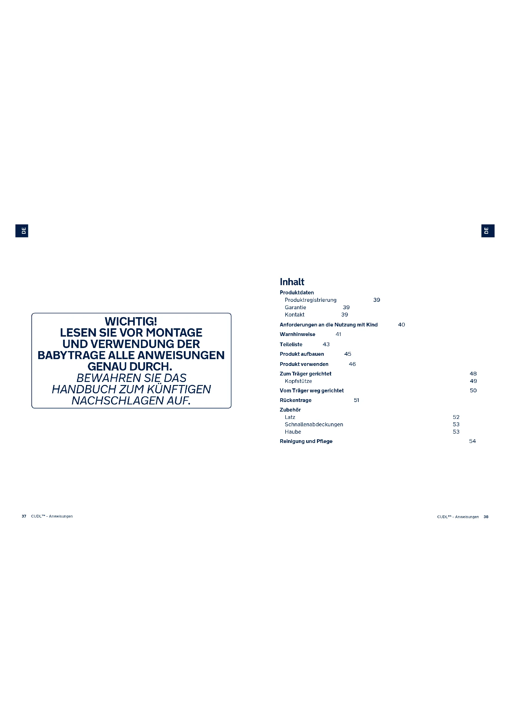 Inhalt Produktdaten Produktregistrierung 39 Garantie 39 Kontakt 39 Anforderungen an die Nutzung mit Kind 40 Warnhinweise 41 Teileliste 43 Produkt aufbauen 45 Produkt verwenden 46 Zum Träger gerichtet 48 Kopfstütze 49 Vom Träger weg gerichtet 50 Rückentrage 51 Zubehör Latz 52 Schnallenabdeckungen 53 Haube 53 Reinigung und Pflege 54 37 CUDL™ – Anweisungen 38CUDL™ – Anweisungen WICHTIG!