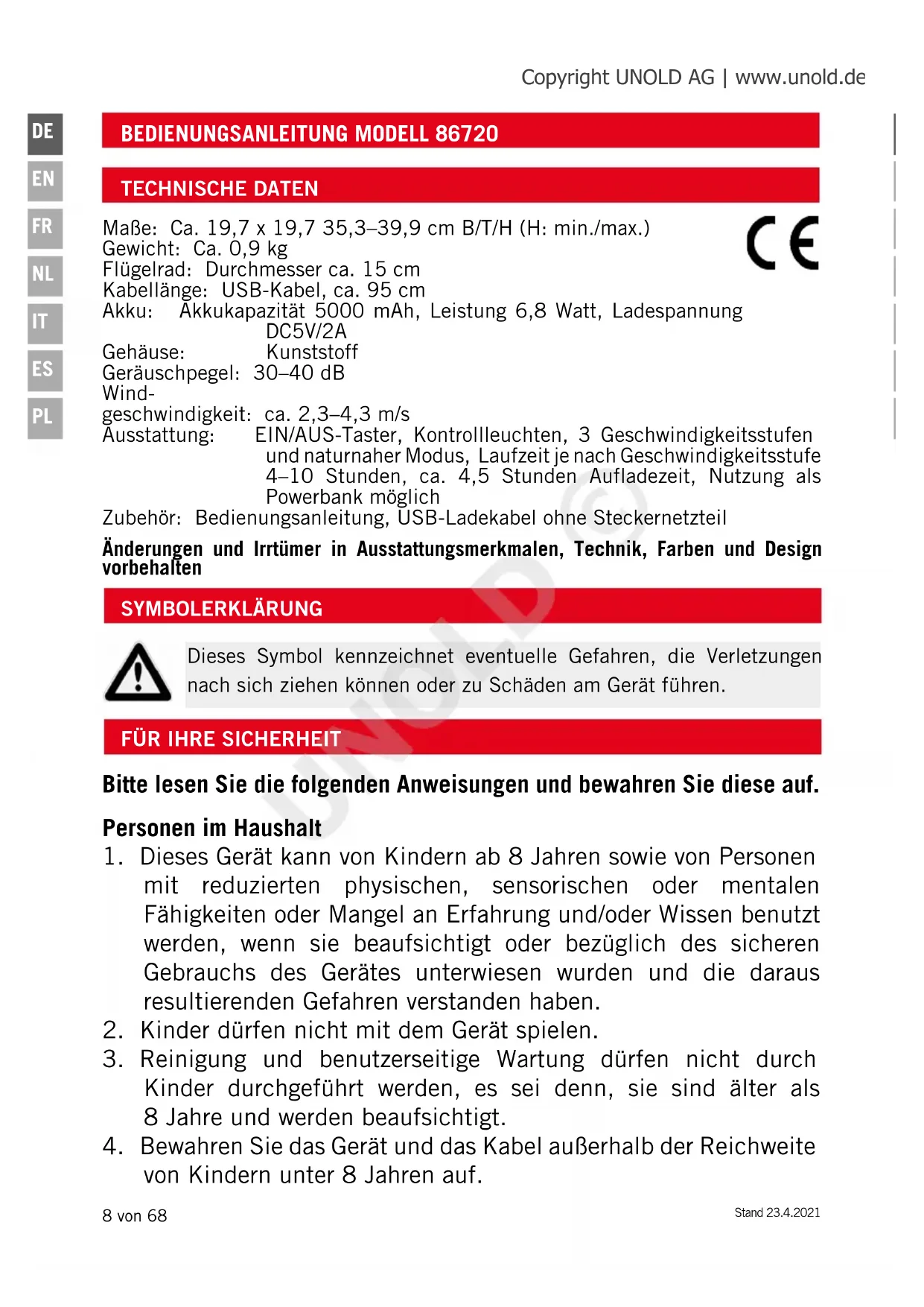 von Kindern unter 8 Jahren auf. SYMBOLERKLÄRUNG Dieses Symbol kennzeichnet eventuelle Gefahren, die Verletzungen nach sich ziehen können oder zu Schäden am Gerät führen. Maße: Ca. 19,7 x 19,7 35,3–39,9 cm B/T/H (H: min./max.) Gewicht: Ca. 0,9 kg Flügelrad: Durchmesser ca. 15 cm Kabellänge: USB-Kabel, ca. 95 cm Akku: Akkukapazität 5000 mAh, Leistung 6,8 Watt, Ladespannung DC5V/2A Gehäuse: Kunststoff Geräuschpegel: 30–40 dB Wind- geschwindigkeit: ca. 2,3–4,3 m/s Ausstattung: EIN/AUS-Taster, Kontrollleuchten, 3 Geschwindigkeitsstufen und naturnaher Modus, Laufzeit je nach Geschwindigkeitsstufe 4–10 Stunden, ca. 4,5 Stunden Aufladezeit, Nutzung als Powerbank möglich Zubehör: Bedienungsanleitung, USB-Ladekabel ohne Steckernetzteil Änderungen und Irrtümer in Ausstattungsmerkmalen, Technik, Farben und Design vorbehalten Copyright UNOLD AG | www.unold.de UNOLD ©Stand 23.4.2021 9 von 68