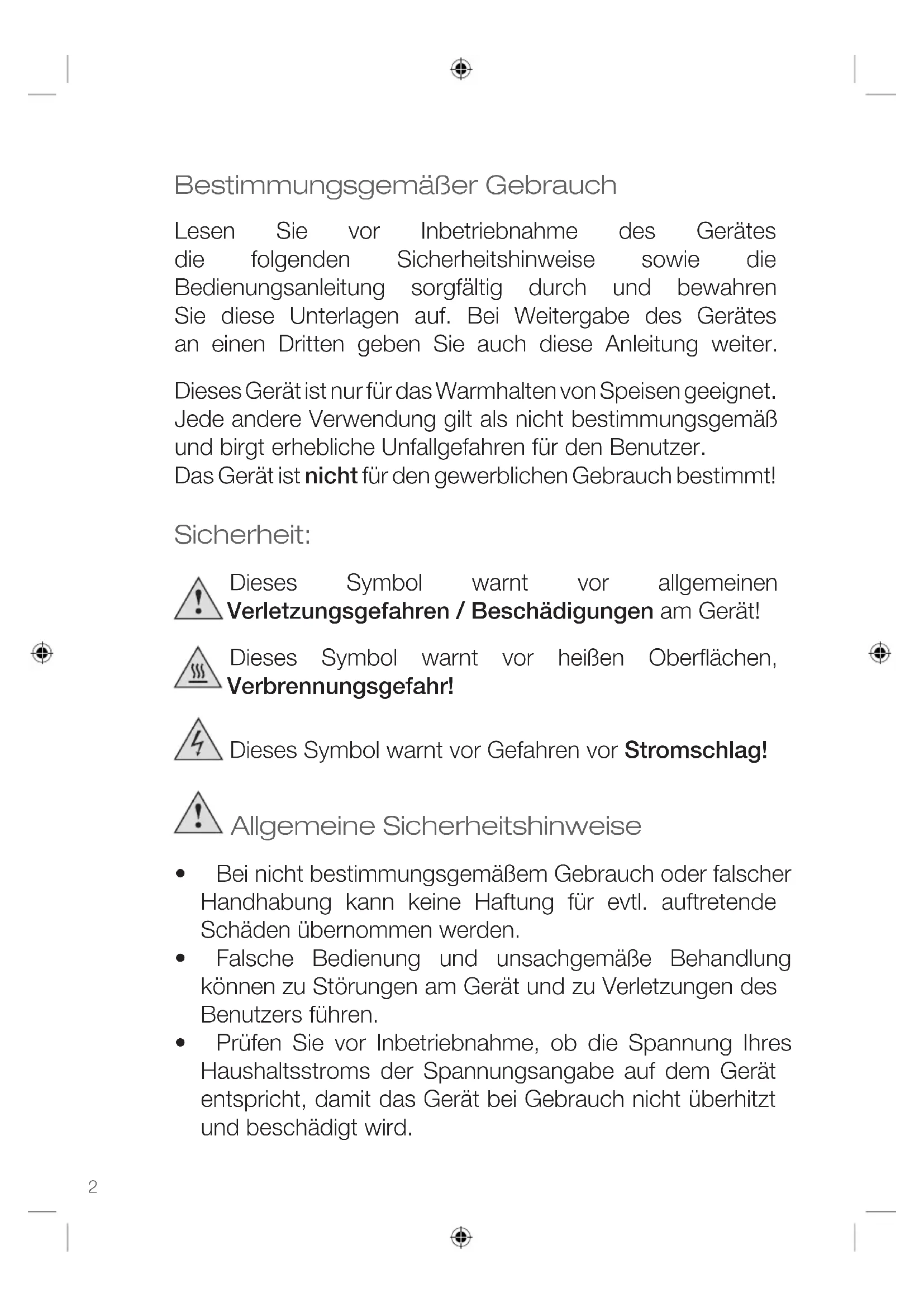 Bestimmungsgemäßer Gebrauch Lesen Sie vor Inbetriebnahme des Gerätes die folgenden Sicherheitshinweise sowie die Bedienungsanleitung sorgfältig durch und bewahren Sie diese Unterlagen auf. Bei Weitergabe des Gerätes an einen Dritten geben Sie auch diese Anleitung weiter. Dieses Gerät ist nur für das Warmhalten von Speisen geeignet. Jede andere Verwendung gilt als nicht bestimmungsgemäß und birgt erhebliche Unfallgefahren für den Benutzer. Das Gerät ist nicht für den gewerblichen Gebrauch bestimmt! Sicherheit: Dieses Symbol warnt vor allgemeinen Verletzungsgefahren / Beschädigungen am Gerät! Dieses Symbol warnt vor heißen Oberflächen, Verbrennungsgefahr! Dieses Symbol warnt vor Gefahren vor Stromschlag! Allgemeine Sicherheitshinweise