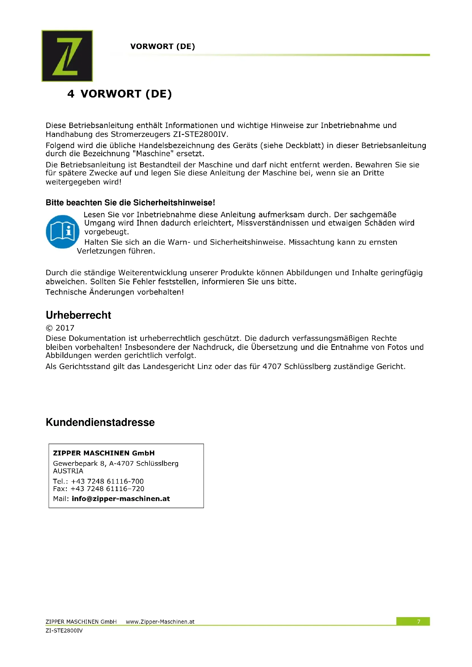 95dB(A) Maschinenmaße /machine dimension / Dimenzije stroja / Dimensions de la machine 470 x 420 x 480 mm Gewicht (Netto) /weight (net) / Težina / Poids 33 kg Gewicht (Brutto) /weight (gross) / Težina / Poids 34 kgVORWORT (DE) ZIPPER MASCHINEN GmbH www.Zipper-Maschinen.at 7 ZI-STE2800IV 4 VORWORT (DE) Diese Betriebsanleitung enthält Informationen und wichtige Hinweise zur Inbetriebnahme und Handhabung des Stromerzeugers ZI-STE2800IV. Folgend wird die übliche Handelsbezeichnung des Geräts (siehe Deckblatt) in dieser Betriebsanleitung durch die Bezeichnung "Maschine" ersetzt. Die Betriebsanleitung ist Bestandteil der Maschine und darf nicht entfernt werden. Bewahren Sie sie für spätere Zwecke auf und legen Sie diese Anleitung der Maschine bei, wenn sie an Dritte weitergegeben wird! Bitte beachten Sie die Sicherheitshinweise! Lesen Sie vor Inbetriebnahme diese Anleitung aufmerksam durch. Der sachgemäße Umgang wird Ihnen dadurch erleichtert, Missverständnissen und etwaigen Schäden wird vorgebeugt. Halten Sie sich an die Warn- und Sicherheitshinweise. Missachtung kann zu ernsten Verletzungen führen. Durch die ständige Weiterentwicklung unserer Produkte können Abbildungen und Inhalte geringfügig abweichen. Sollten Sie Fehler feststellen, informieren Sie uns bitte. Technische Änderungen vorbehalten! Urheberrecht © 2017 Diese Dokumentation ist urheberrechtlich geschützt. Die dadurch verfassungsmäßigen Rechte bleiben vorbehalten! Insbesondere der Nachdruck, die Übersetzung und die Entnahme von Fotos und Abbildungen werden gerichtlich verfolgt. Als Gerichtsstand gilt das Landesgericht Linz oder das für 4707 Schlüsslberg zuständige Gericht.