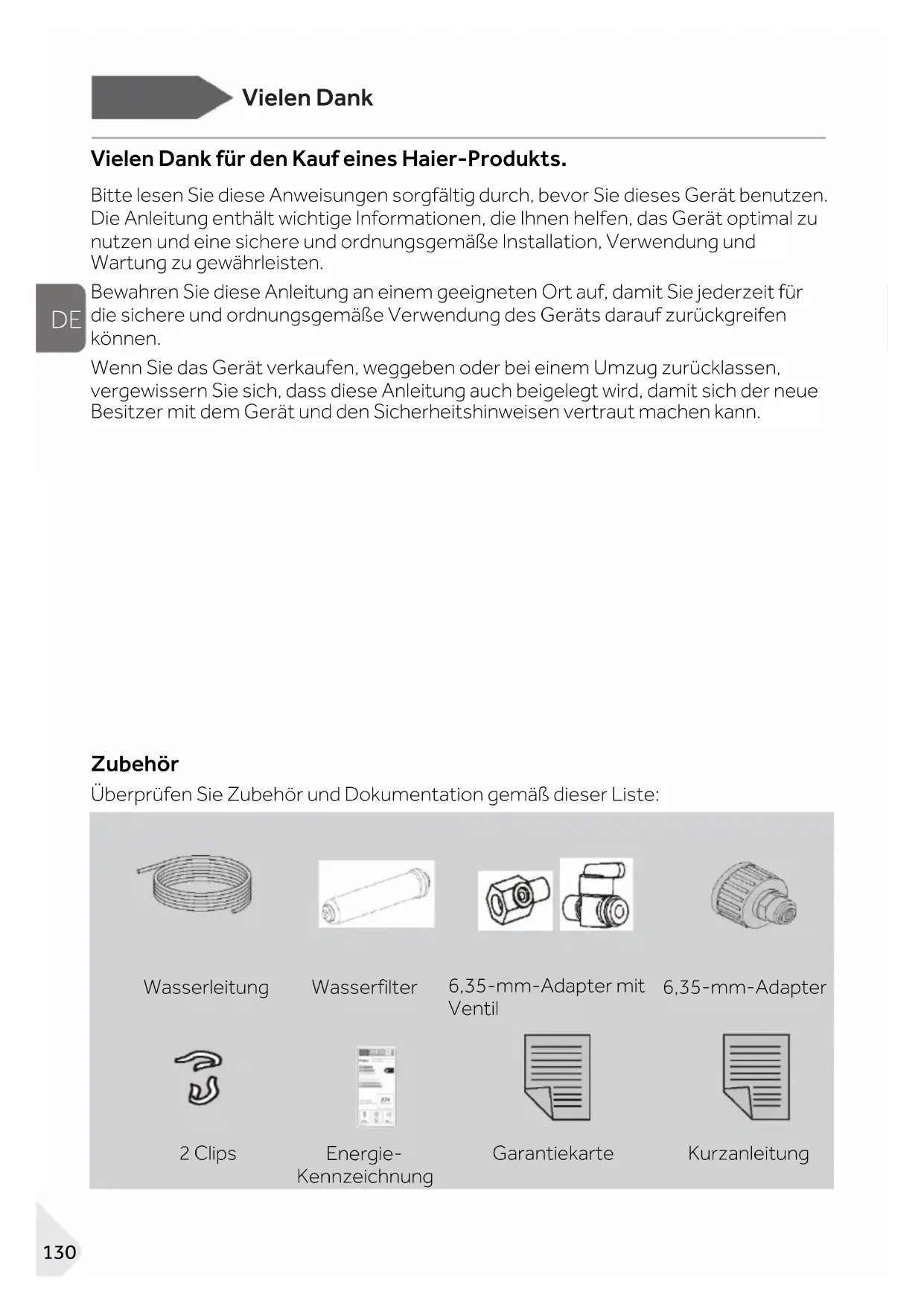 Vielen Dank für den Kauf eines Haier-Produkts. Bitte lesen Sie diese Anweisungen sorgfältig durch, bevor Sie dieses Gerät benutzen. Die Anleitung enthält wichtige Informationen, die Ihnen helfen, das Gerät optimal zu nutzen und eine sichere und ordnungsgemäße Installation, Verwendung und Wartung zu gewährleisten. Bewahren Sie diese Anleitung an einem geeigneten Ort auf, damit Sie jederzeit für die sichere und ordnungsgemäße Verwendung des Geräts darauf zurückgreifen können. Wenn Sie das Gerät verkaufen, weggeben oder bei einem Umzug zurücklassen, vergewissern Sie sich, dass diese Anleitung auch beigelegt wird, damit sich der neue Besitzer mit dem Gerät und den Sicherheitshinweisen vertraut machen kann. Zubehör Überprüfen Sie Zubehör und Dokumentation gemäß dieser Liste: