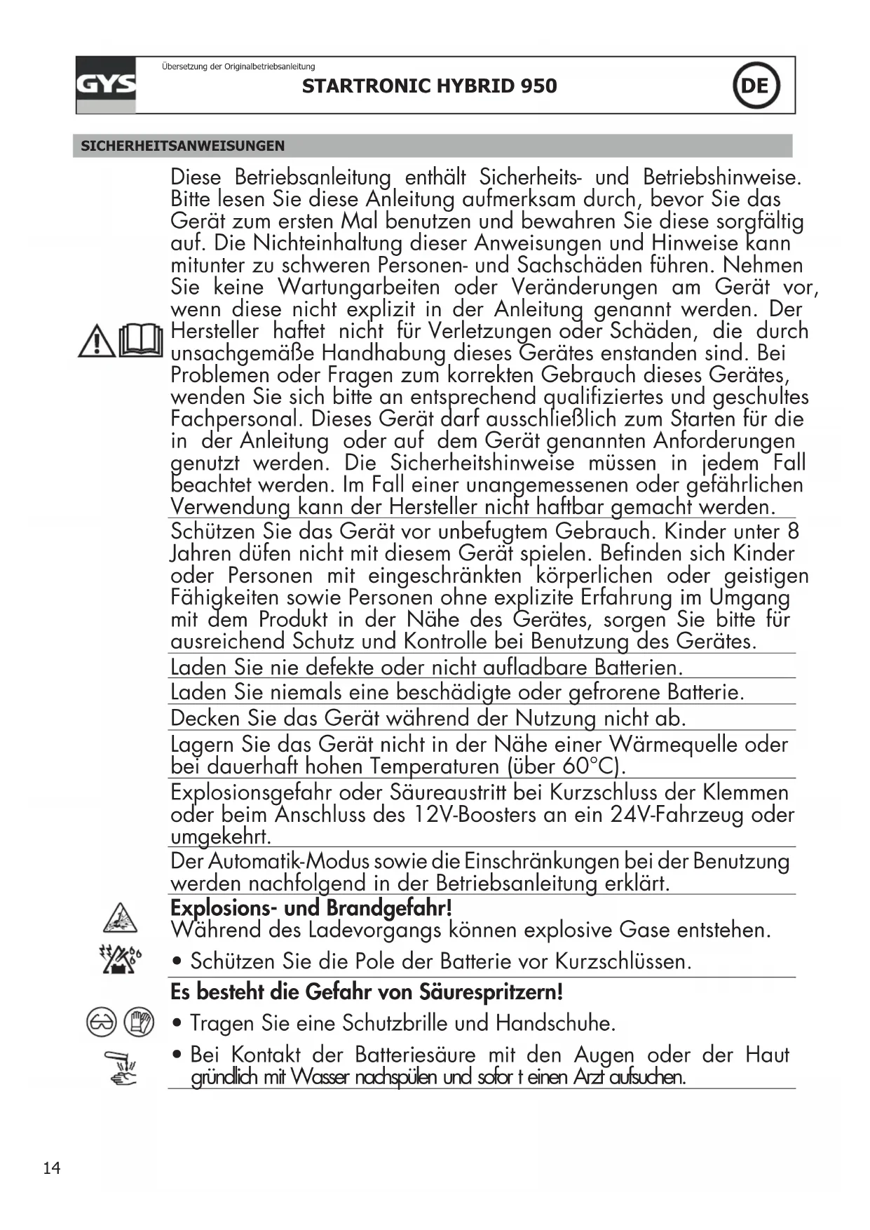 - Bei Kontakt der Batteriesäure mit den Augen oder der Haut gründlich mit Wasser nachspülen und sofor t einen Arzt aufsuchen.15 STARTRONIC HYBRID 950