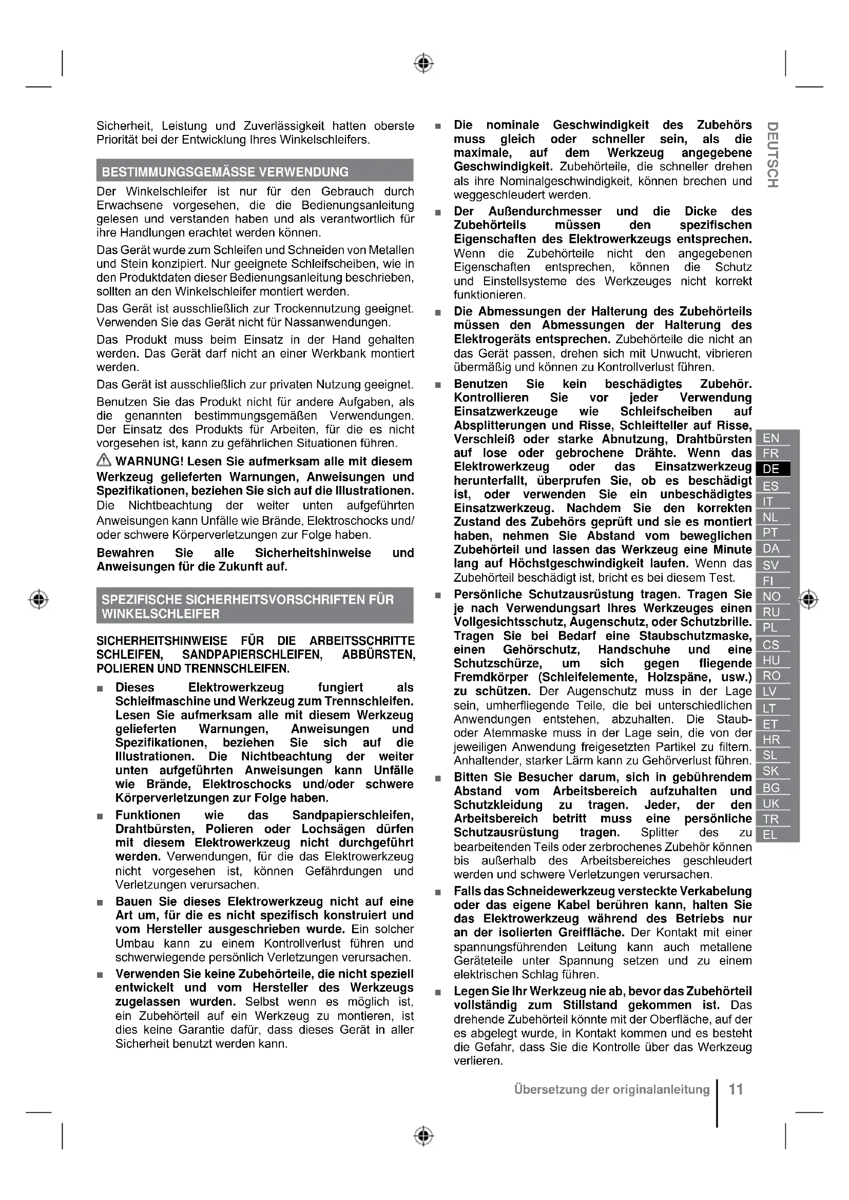 SCHLEIFEN, SANDPAPIERSCHLEIFEN, ABBÜRSTEN, POLIEREN UND TRENNSCHLEIFEN. ■ Dieses Elektrowerkzeug fungiert als Schleifmaschine und Werkzeug zum Trennschleifen. Lesen Sie aufmerksam alle mit diesem Werkzeug gelieferten Warnungen, Anweisungen und Spezifikationen, beziehen Sie sich auf die Illustrationen. Die Nichtbeachtung der weiter unten aufgeführten Anweisungen kann Unfälle wie Brände, Elektroschocks und/oder schwere Körperverletzungen zur Folge haben. ■ Funktionen wie das Sandpapierschleifen, Drahtbürsten, Polieren oder Lochsägen dürfen mit diesem Elektrowerkzeug nicht durchgeführt werden. Verwendungen, für die das Elektrowerkzeug nicht vorgesehen ist, können Gefährdungen und Verletzungen verursachen. ■ Bauen Sie dieses Elektrowerkzeug nicht auf eine Art um, für die es nicht spezifisch konstruiert und vom Hersteller ausgeschrieben wurde. Ein solcher Umbau kann zu einem Kontrollverlust führen und schwerwiegende persönlich Verletzungen verursachen. ■ Verwenden Sie keine Zubehörteile, die nicht speziell entwickelt und vom Hersteller des Werkzeugs zugelassen wurden. Selbst wenn es möglich ist, ein Zubehörteil auf ein Werkzeug zu montieren, ist dies keine Garantie dafür, dass dieses Gerät in aller Sicherheit benutzt werden kann. ■ Die nominale Geschwindigkeit des Zubehörs muss gleich oder schneller sein, als die maximale, auf dem Werkzeug angegebene Geschwindigkeit. Zubehörteile, die schneller drehen als ihre Nominalgeschwindigkeit, können brechen und weggeschleudert werden. ■ Der Außendurchmesser und die Dicke des Zubehörteils müssen den spezifischen Eigenschaften des Elektrowerkzeugs entsprechen. Wenn die Zubehörteile nicht den angegebenen Eigenschaften entsprechen, können die Schutz und Einstellsysteme des Werkzeuges nicht korrekt funktionieren. ■ Die Abmessungen der Halterung des Zubehörteils müssen den Abmessungen der Halterung des Elektrogeräts entsprechen. Zubehörteile die nicht an das Gerät passen, drehen sich mit Unwucht, vibrieren übermäßig und können zu Kontrollverlust führen. ■ Benutzen Sie kein beschädigtes Zubehör. Kontrollieren Sie vor jeder Verwendung Einsatzwerkzeuge wie Schleifscheiben auf Absplitterungen und Risse, Schleifteller auf Risse, Verschleiß oder starke Abnutzung, Drahtbürsten auf lose oder gebrochene Drähte. Wenn das Elektrowerkzeug oder das Einsatzwerkzeug herunterfallt, überprufen Sie, ob es beschädigt ist, oder verwenden Sie ein unbeschädigtes Einsatzwerkzeug. Nachdem Sie den korrekten Zustand des Zubehörs geprüft und sie es montiert haben, nehmen Sie Abstand vom beweglichen Zubehörteil und lassen das Werkzeug eine Minute lang auf Höchstgeschwindigkeit laufen. Wenn das Zubehörteil beschädigt ist, bricht es bei diesem Test. ■ Persönliche Schutzausrüstung tragen. Tragen Sie je nach Verwendungsart Ihres Werkzeuges einen Vollgesichtsschutz, Augenschutz, oder Schutzbrille. Tragen Sie bei Bedarf eine Staubschutzmaske, einen Gehörschutz, Handschuhe und eine Schutzschürze, um sich gegen fliegende Fremdkörper (Schleifelemente, Holzspäne, usw.) zu schützen. Der Augenschutz muss in der Lage sein, umherfliegende Teile, die bei unterschiedlichen Anwendungen entstehen, abzuhalten. Die Staub- oder Atemmaske muss in der Lage sein, die von der jeweiligen Anwendung freigesetzten Partikel zu filtern. Anhaltender, starker Lärm kann zu Gehörverlust führen. ■ Bitten Sie Besucher darum, sich in gebührendem Abstand vom Arbeitsbereich aufzuhalten und Schutzkleidung zu tragen. Jeder, der den Arbeitsbereich betritt muss eine persönliche Schutzausrüstung tragen. Splitter des zu bearbeitenden Teils oder zerbrochenes Zubehör können bis außerhalb des Arbeitsbereiches geschleudert werden und schwere Verletzungen verursachen. ■ Falls das Schneidewerkzeug versteckte Verkabelung oder das eigene Kabel berühren kann, halten Sie das Elektrowerkzeug während des Betriebs nur an der isolierten Greiffläche. Der Kontakt mit einer spannungsführenden Leitung kann auch metallene Geräteteile unter Spannung setzen und zu einem elektrischen Schlag führen. ■ Legen Sie Ihr Werkzeug nie ab, bevor das Zubehörteil vollständig zum Stillstand gekommen ist. Das drehende Zubehörteil könnte mit der Oberfläche, auf der es abgelegt wurde, in Kontakt kommen und es besteht die Gefahr, dass Sie die Kontrolle über das Werkzeug verlieren.12 Übersetzung der originalanleitung ■ Lassen Sie Ihr Werkzeug nicht eingeschaltet, während Sie es transportieren. Das sich drehende Zubehörteil könnte sich in Ihren Kleidern verfangen und Sie schwer verletzen. ■ Säubern Sie regelmäßig die Lüftungsspalten des Werkzeugs. Die Motorlüftung lässt Staub ins Motorgehäuseinnere eindringen, dies kann zur Ansammlung von Metallpartikeln führen und Elektroschocks auslösen. ■ Benutzen Sie Ihr Werkzeug nicht in der Nähe leicht entflammbarer Produkte. Funken könnten sie entflammen. ■ Benutzen Sie kein Zubehör, das Kühlwasser benötigt. Die Benutzung von Wasser oder Kühlflüssigkeiten kann elektrische Schläge oder Elektroschocks verursachen. Rückschlag und entsprechende Sicherheitshinweise Rückschlag ist die plötzliche Reaktion infolge eines hakenden oder blockierten drehenden Einsatzwerkzeugs, wie Schleifscheibe, Schleifteller, Drahtbürste usw. Verhaken oder Blockieren führt zu einem abrupten Stopp des rotierenden Einsatzwerkzeugs. Dadurch wird ein unkontrolliertes Elektrowerkzeug gegen die Drehrichtung des Einsatzwerkzeugs an der Blockierstelle beschleunigt. Wenn z. B. eine Schleifscheibe im Werkstück hakt oder blockiert, kann sich die Kante der Schleifscheibe, die in das Werkstück eintaucht, verfangen und dadurch die Schleifscheibe ausbrechen oder einen Rückschlag verursachen. Die Schleifscheibe bewegt sich dann auf die Bedienperson zu oder von ihr weg, je nach Drehrichtung der Scheibe an der Blockierstelle. Hierbei können Schleifscheiben auch brechen. Ein Rückschlag ist die Folge eines falschen oder fehlerhaften G