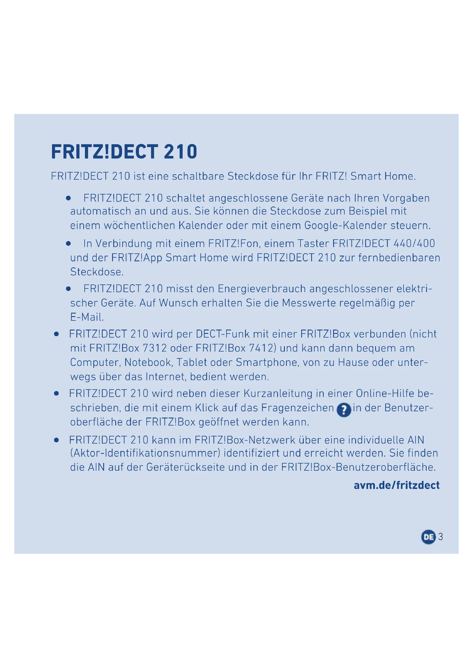 FRITZ!DECT210 ist eine schaltbare Steckdose für Ihr FRITZ! Smart Home. ˊ FRITZ!DECT210 schaltet angeschlossene Geräte nach Ihren Vorgaben automatisch an und aus. Sie können die Steckdose zum Beispiel mit einem wöchentlichen Kalender oder mit einem Google-Kalender steuern. ˊ In Verbindung mit einem FRITZ!Fon, einem Taster FRITZ!DECT440/400 und der FRITZ!AppSmartHome wird FRITZ!DECT210 zur fernbedienbaren Steckdose. ˊ FRITZ!DECT210 misst den Energieverbrauch angeschlossener elektri- scher Geräte. Auf Wunsch erhalten Sie die Messwerte regelmäßig per E-Mail. ˊ FRITZ!DECT210 wird per DECT-Funk mit einer FRITZ!Box verbunden (nicht mit FRITZ!Box7312 oder FRITZ!Box7412) und kann dann bequem am Computer, Notebook, Tablet oder Smartphone, von zu Hause oder unter- wegs über das Internet, bedient werden. ˊ FRITZ!DECT210 wird neben dieser Kurzanleitung in einer Online-Hilfe be- schrieben, die mit einem Klick auf das Fragenzeichen in der Benutzer- oberäche der FRITZ!Box geönet werden kann. ˊ FRITZ!DECT210 kann im FRITZ!Box-Netzwerk über eine individuelle AIN (Aktor-Identikationsnummer) identiziert und erreicht werden. Sie nden die AIN auf der Geräterückseite und in der FRITZ!Box-Benutzeroberäche. avm.de/fritzdect 3Sicherheit ˊ Belasten Sie FRITZ!DECT210 nur bis zur Leistungsgrenze von 3450W/15A (Ohm’sche Last). Eine Überlastung kann FRITZ!DECT210 beschädigen, Fehlfunktionen oder einen elektrischen Unfall auslösen. ˊ Betreiben Sie FRITZ!DECT210 an einer leicht erreichbaren Steckdose, an einem Ort ohne direkte Sonneneinstrahlung und mit ausreichender Belüftung. ˊ Setzen Sie FRITZ!DECT210 keinem direkten Wasserstrahl oder direktem Regen aus. FRITZ!DECT210 ist nach IP44 spritzwassergeschützt. Der Spritzwasserschutz IP44 besteht nur, wenn auch die beteiligten Kom- ponenten, Stromstecker und Stromsteckdose, die gleiche Schutzklasse aufweisen. ˊ Stecken Sie mehrere FRITZ!DECT210 nicht ineinander. ˊ Betreiben Sie keine Geräte mit Brandgefahr (z.B. Bügeleisen, Heizstrahler, Elektrogrill) unbeaufsichtigt am FRITZ!DECT210. ˊ Verändern Sie FRITZ!DECT210 nicht. FRITZ!DECT210 darf nicht geönet, umgebaut, modiziert oder unsachgemäß repariert werden. ˊ Richten Sie für FRITZ!DECT210 nur eine automatische Schaltung ein, wenn die angeschlossenen Geräte dafür ausgelegt sind. Häuges An- und Ausschalten kann die Lebensdauer elektrischer Geräte verkürzen. Für entsprechende Schäden an angeschlossenen Geräten wird nicht gehaftet. 4Lieferumfang Bezeichnung Abbildung 1 FRITZ!DECT210 On/Off DECT 1 Kurzanleitung ohne Abbildung Technische Daten ˊ Funkstandard: DECT ˊ Frequenzbereich: 1880MHz – 1902MHz ˊ maximale Sendeleistung: 250mW ˊ Reichweite: in Gebäuden bis zu 40m, im Freien bis zu 300m ˊ maximale Wirkleistung: ca. 1,5W ˊ Wirkleistung im Standby: ca. 0,4W ˊ Messgenauigkeit: +/- 100mW (bis 5W), +/- 2% (ab 5W) ˊ 230V, 50Hz A/C ˊ Maße (ohne Stecker): 65 x 127 x 36mm ˊ Gewicht: ca. 204g ˊ Schutzart: IP44, spritzwassergeschützt ˊ Leistungsgrenze für angeschlos- sene Geräte bis 3450W/15A ˊ Umgebungstemperatur: -20°C bis +40°C ˊ messbarer Temperaturbereich: -5°C bis +40°C 5An einer FRITZ!Box anmelden Handlung Abbildung