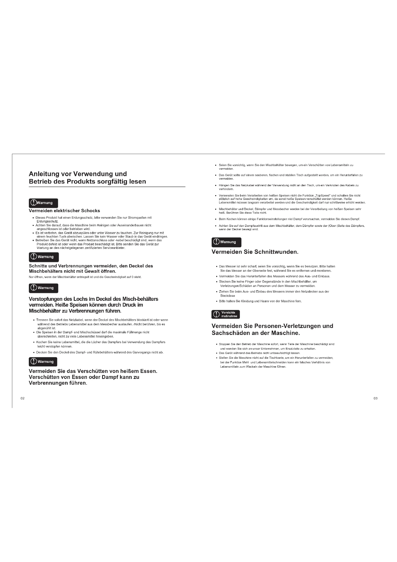 - ieses rodut hat einen rdungsschutz, bitte verenden Sie nur Stromquellen mitrdungsschutz.• Achten Sie darauf, dass die aschine beim einigen oder Auseinanderbauen nichtangeschlossen ist oder betrieben ird.• s ist verboten, das Gert abzusplen oder unter asser zu tauchen. ur einigung nur miteinem feuchten uch abischen. assen Sie ein asser oder Staub in das Gert eindringen.• etreiben Sie das Gert nicht, enn etzanschluss oder -abel beschdigt sind, enn dasrodut defet ist oder enn das rodut beschdigt ist. itte senden Sie das Gert zurartung an den nchstgelegenen zertifizierten Serviceanbieter.• rennen Sie sofort das etzabel, enn der ecel des ischbehlters blociert ist oder ennhrend des etriebs ebensmittel aus dem essbecher auslaufen. icht berhren, bis esabgehlt ist.• ie Speisen in der ampf- und ischschssel darf die maimale llmenge nichtberschreiten, nicht zu viele ebensmittel hineingeben.• ochen Sie eine ebensmittel, die die cher des ampfers bei erendung des ampfersleicht verstopfen nnen.• ecen Sie den ecel des ampf- und hrbehlters hrend des Garvorgangs nicht ab. ermeden Se das erschtten von heem Essen erschtten von Essen oder amp ann u erbrennungen hren