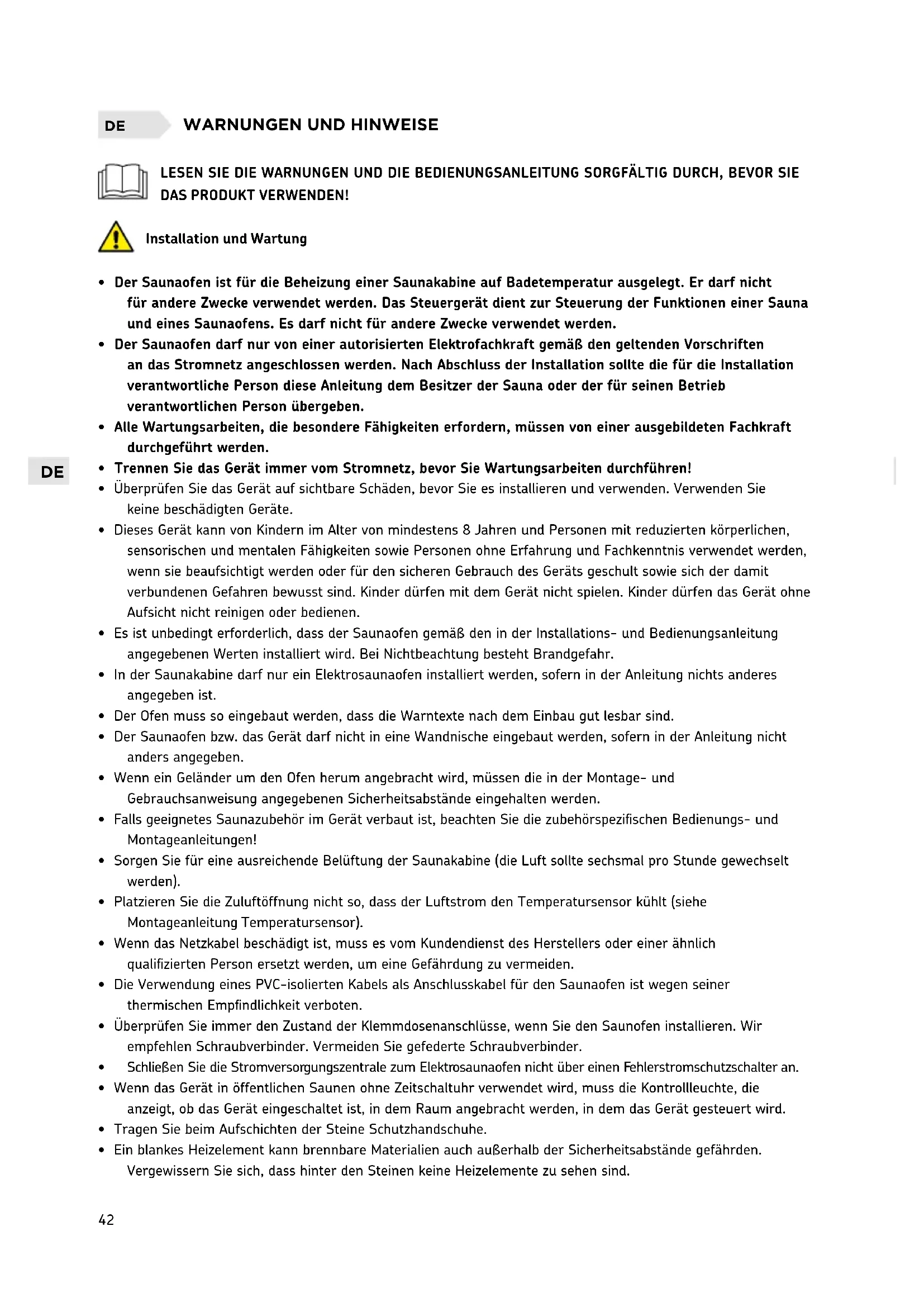- In der Saunakabine darf nur ein Elektrosaunaofen installiert werden, sofern in der Anleitung nichts anderes angegeben ist.