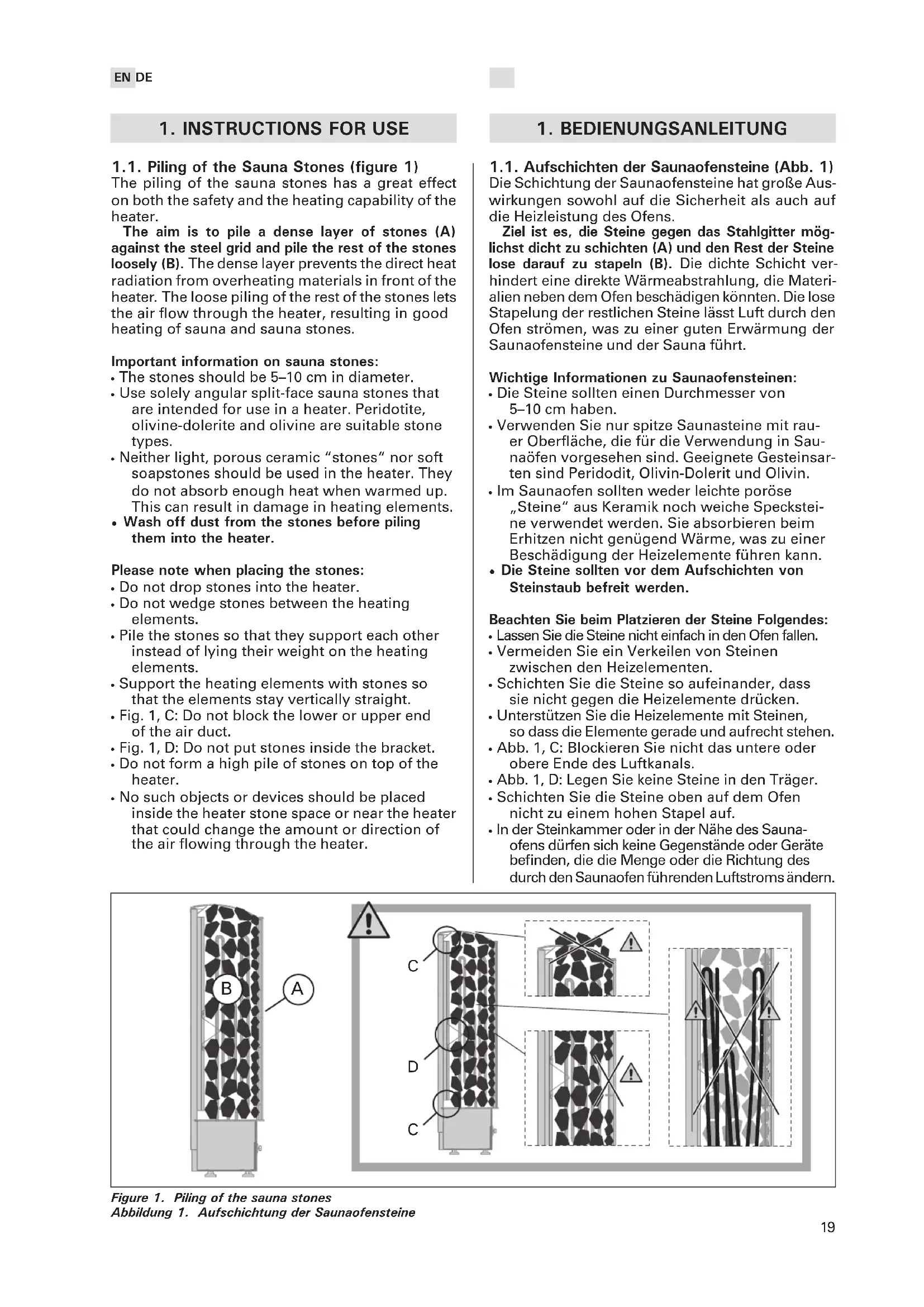 1.1. Piling of the Sauna Stones (figure 1) The piling of the sauna stones has a great effect on both the safety and the heating capability of the heater.The aim is to pile a dense layer of stones (A) against the steel grid and pile the rest of the stones loosely (B). The dense layer prevents the direct heat radiation from overheating materials in front of the heater. The loose piling of the rest of the stones lets the air ow through the heater, resulting in good heating of sauna and sauna stones.Important information on sauna stones:• The stones should be 5–10 cm in diameter.• Use solely angular split-face sauna stones that are intended for use in a heater. Peridotite, olivine-dolerite and olivine are suitable stone types.• Neither light, porous ceramic “stones“ nor soft soapstones should be used in the heater. They do not absorb enough heat when warmed up. This can result in damage in heating elements.• Wash off dust from the stones before piling them into the heater.Please note when placing the stones:• Do not drop stones into the heater.• Do not wedge stones between the heating elements.• Pile the stones so that they support each other instead of lying their weight on the heating elements.• Support the heating elements with stones so that the elements stay vertically straight.• Fig. 1, C: Do not block the lower or upper end of the air duct.• Fig. 1, D: Do not put stones inside the bracket.• Do not form a high pile of stones on top of the heater.• No such objects or devices should be placed inside the heater stone space or near the heater that could change the amount or direction of the air owing through the heater.Figure 1. Piling of the sauna stonesAbbildung 1. Aufschichtung der Saunaofensteine