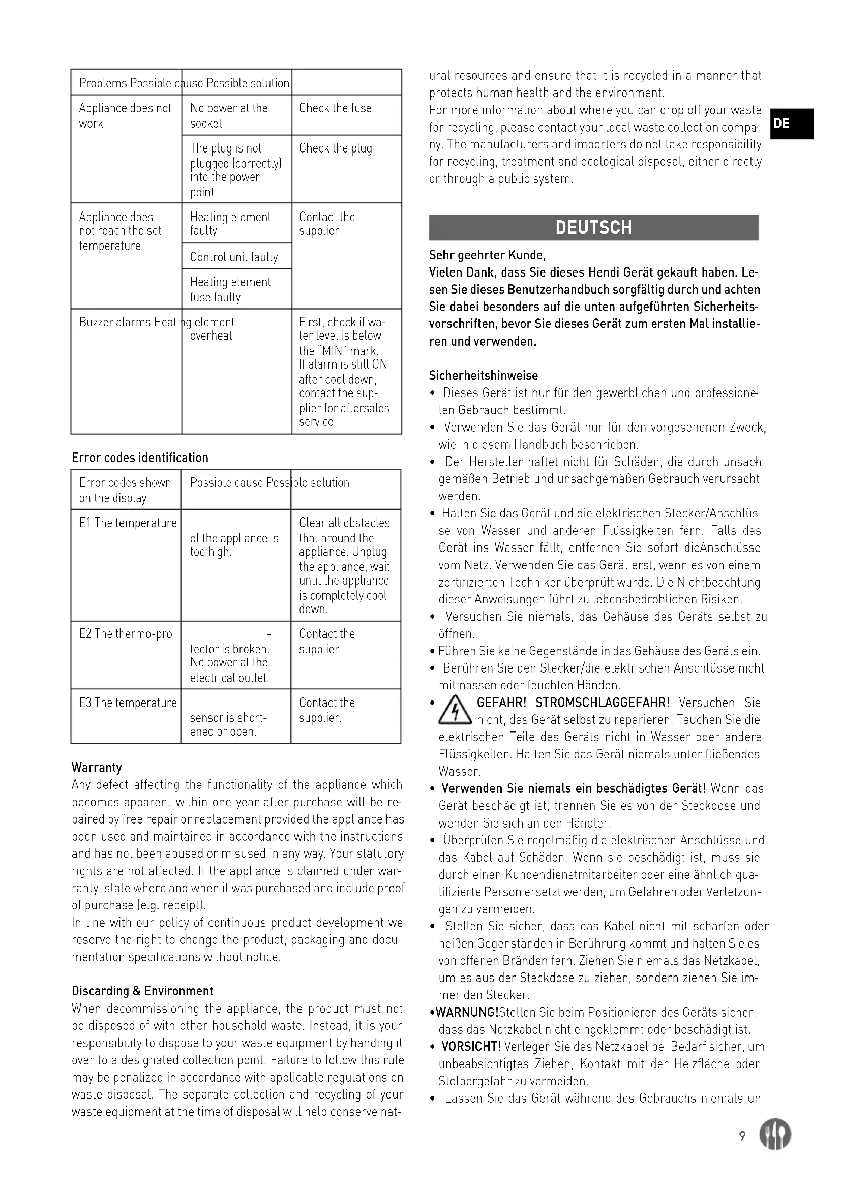 mentu grzejnego Najpierw sprawdź, czy poziom wody jest poniżej znaku „MIN”. Jeśli alarm jest nadal włączony po ostygnięciu, należy skontaktować się z dostawcą w celu uzyskania pomocy posprzedażnej Identyfikacja kodu błędu Auf dem Display angezeigte Fehler- codes Mögliche Ursache Mögliche Lösung E1 Die Temperatur des Geräts ist zu hoch. Entfernen Sie alle Hindernisse, die sich um das Gerät herum befinden. Ziehen Sie den Netzstecker des Geräts und warten Sie, bis das Gerät vollständig abgekühlt ist. E2 Der Thermoschutz ist defekt. Keine Stromversorgung an der Steckdose. Wenden Sie sich an den Lieferanten. E3 Der Temperatur