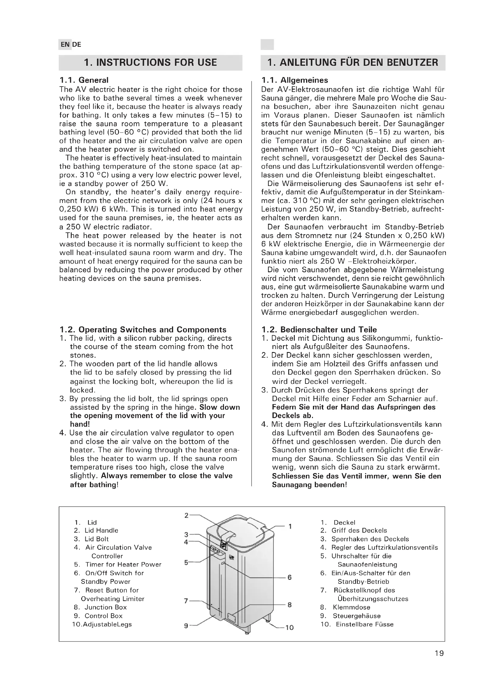 1.1. Allgemeines Der AV-Elektrosaunaofen ist die richtige Wahl für Sauna gänger, die mehrere Male pro Woche die Sau- na besuchen, aber ihre Saunazeiten nicht genau im Voraus planen. Dieser Saunaofen ist nämlich stets für den Saunabesuch bereit. Der Saunagänger braucht nur wenige Minuten (5–15) zu warten, bis die Temperatur in der Saunakabine auf einen an- genehmen Wert (50–60 ºC) steigt. Dies geschieht recht schnell, vorausgesetzt der Deckel des Sauna- ofens und das Luftzirkulationsventil werden offenge- lassen und die Ofenleistung bleibt eingeschaltet. Die Wärmeisolierung des Saunaofens ist sehr ef- fektiv, damit die Aufgußtemperatur in der Steinkam- mer (ca. 310 ºC) mit der sehr geringen elektrischen Leistung von 250 W, im Standby-Betrieb, aufrecht- erhalten werden kann. Der Saunaofen verbraucht im Standby-Betrieb aus dem Stromnetz nur (24 Stunden x 0,250 kW) 6 kW elektrische Energie, die in Wärmeenergie der Sauna kabine umgewandelt wird, d.h. der Saunaofen funktio niert als 250 W –Elektroheizkörper. Die vom Saunaofen abgegebene Wärmeleistung wird nicht verschwendet, denn sie reicht gewöhnlich aus, eine gut wärmeisolierte Saunakabine warm und trocken zu halten. Durch Verringerung der Leistung der anderen Heizkörper in der Saunakabine kann der Wärme energiebedarf ausgeglichen werden. 1.2. Bedienschalter und Teile