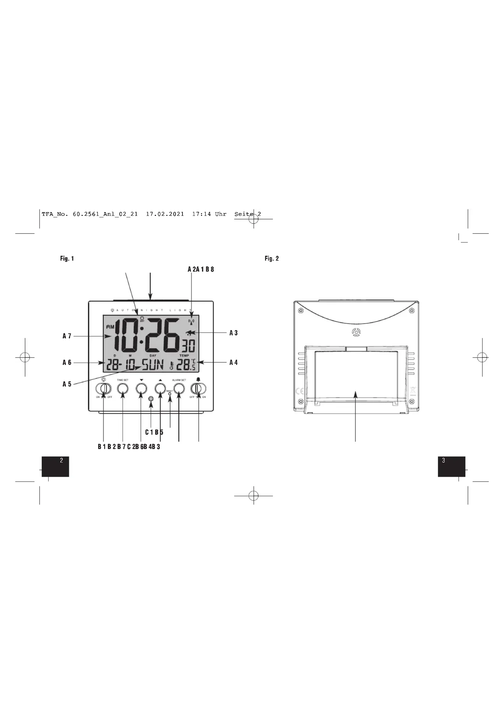 Fig. 2 A 2A 1 B 8 A 3 A 4 C 1 B 5 B 1 B 2 B 7 C 2B 6B 4B 3 TFA_No. 60.2561_Anl_02_21 17.02.2021 17:14 Uhr Seite 2Funkwecker mit Temperatur