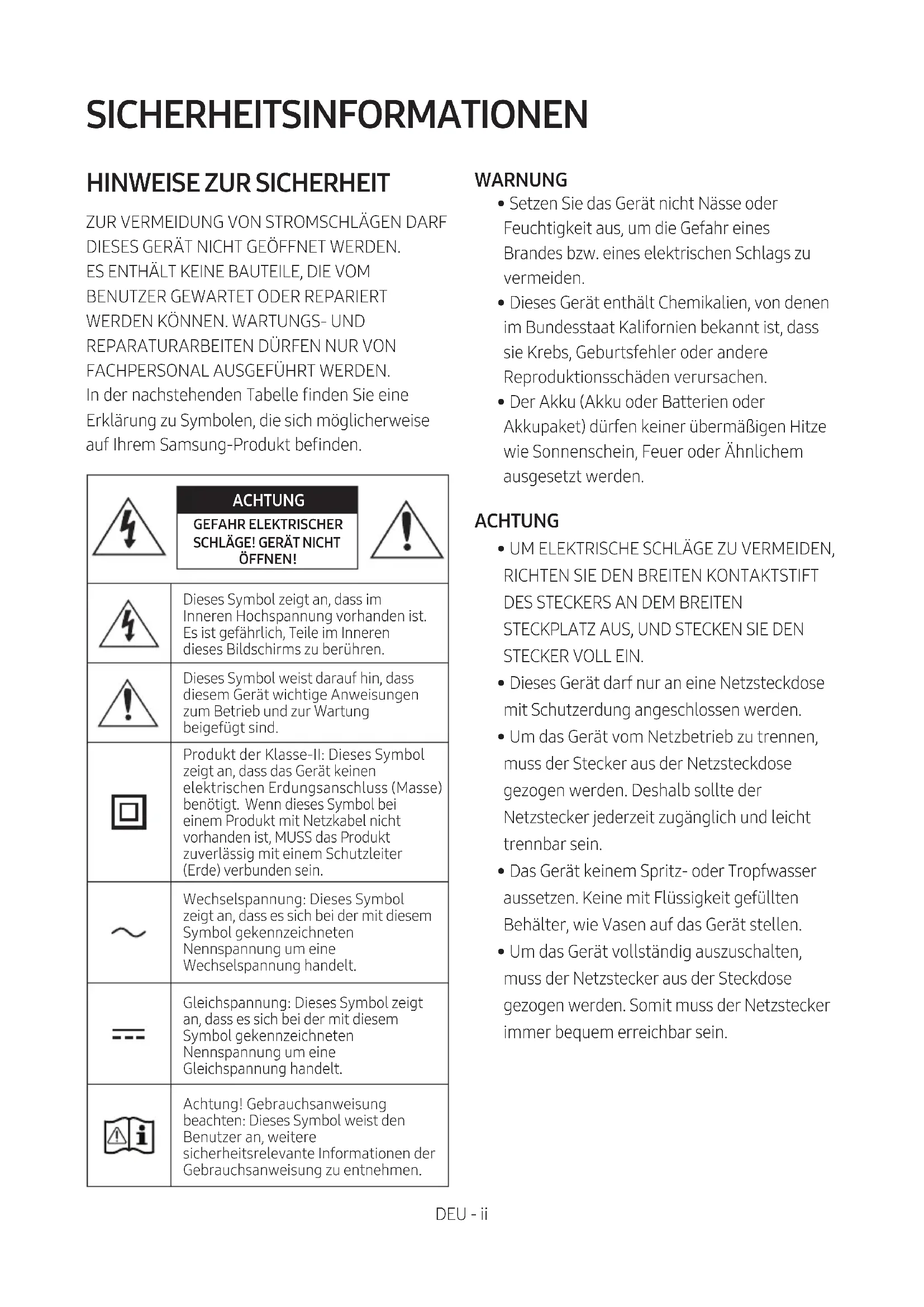 FACHPERSONAL AUSGEFÜHRT WERDEN. In der nachstehenden Tabelle nden Sie eine Erklärung zu Symbolen, die sich möglicherweise auf Ihrem Samsung-Produkt benden. ACHTUNG GEFAHR ELEKTRISCHER SCHLÄGE!GERÄTNICHTÖFFNEN!Dieses Symbol zeigt an, dass im Inneren Hochspannung vorhanden ist. Es ist gefährlich, Teile im Inneren dieses Bildschirms zu berühren.Dieses Symbol weist darauf hin, dass diesem Gerät wichtige Anweisungen zum Betrieb und zur Wartung beigefügt sind.Produkt der Klasse-II: Dieses Symbol zeigt an, dass das Gerät keinen elektrischen Erdungsanschluss (Masse) benötigt. Wenn dieses Symbol bei einem Produkt mit Netzkabel nicht vorhanden ist, MUSS das Produkt zuverlässig mit einem Schutzleiter (Erde) verbunden sein.Wechselspannung: Dieses Symbol zeigt an, dass es sich bei der mit diesem Symbol gekennzeichneten Nennspannung um eine Wechselspannung handelt.Gleichspannung: Dieses Symbol zeigt an, dass es sich bei der mit diesem Symbol gekennzeichneten Nennspannung um eine Gleichspannung handelt.Achtung! Gebrauchsanweisung beachten: Dieses Symbol weist den Benutzer an, weitere sicherheitsrelevante Informationen der Gebrauchsanweisung zu entnehmen. WARNUNG