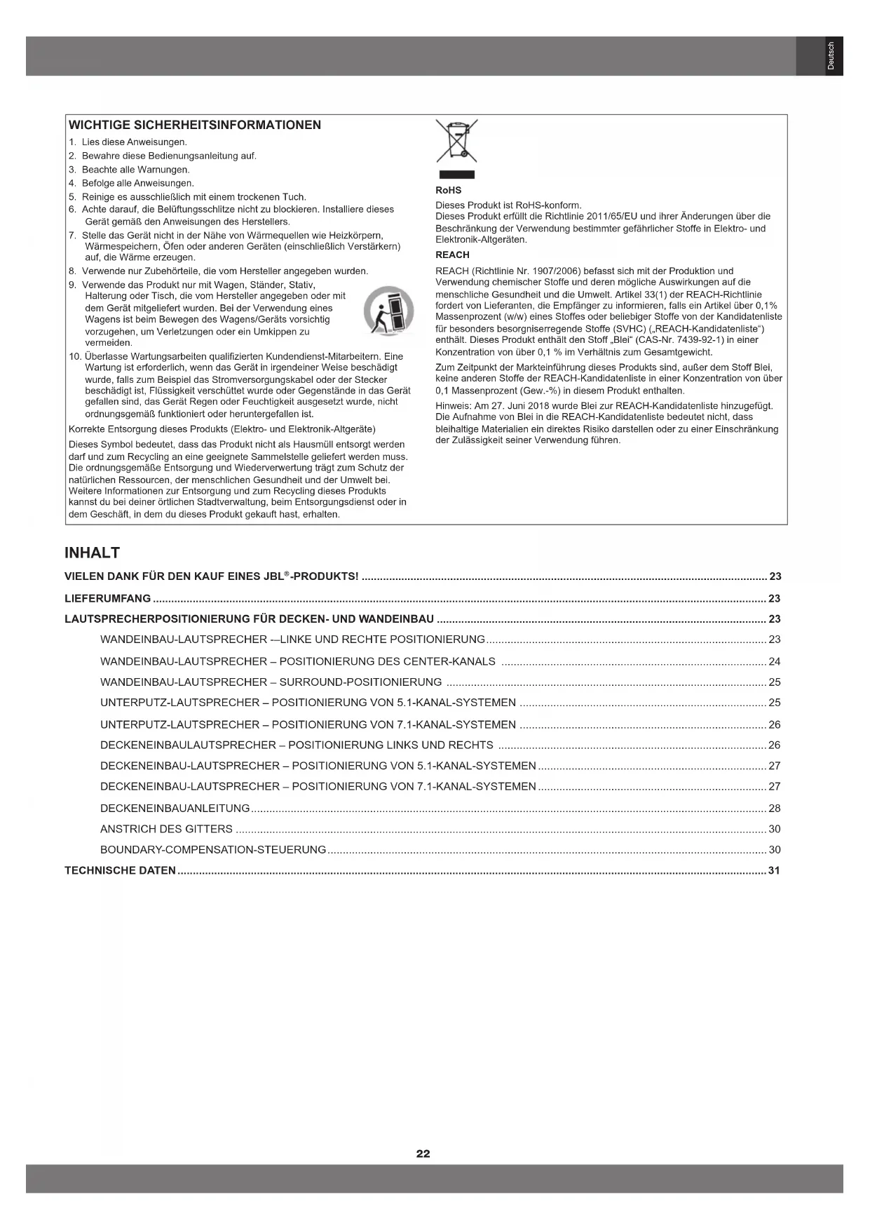 Wartung ist erforderlich, wenn das Gerät in irgendeiner Weise beschädigt wurde, falls zum Beispiel das Stromversorgungskabel oder der Stecker beschädigt ist, Flüssigkeit verschüttet wurde oder Gegenstände in das Gerät gefallen sind, das Gerät Regen oder Feuchtigkeit ausgesetzt wurde, nicht ordnungsgemäß funktioniert oder heruntergefallen ist. Korrekte Entsorgung dieses Produkts (Elektro- und Elektronik-Altgeräte) Dieses Symbol bedeutet, dass das Produkt nicht als Hausmüll entsorgt werden darf und zum Recycling an eine geeignete Sammelstelle geliefert werden muss. Die ordnungsgemäße Entsorgung und Wiederverwertung trägt zum Schutz der natürlichen Ressourcen, der menschlichen Gesundheit und der Umwelt bei. Weitere Informationen zur Entsorgung und zum Recycling dieses Produkts kannst du bei deiner örtlichen Stadtverwaltung, beim Entsorgungsdienst oder in dem Geschäft, in dem du dieses Produkt gekauft hast, erhalten. RoHS Dieses Produkt ist RoHS-konform. Dieses Produkt erfüllt die Richtlinie 2011/65/EU und ihrer Änderungen über die Beschränkung der Verwendung bestimmter gefährlicher Stoffe in Elektro- und Elektronik-Altgeräten. REACH REACH (Richtlinie Nr. 1907/2006) befasst sich mit der Produktion und Verwendung chemischer Stoffe und deren mögliche Auswirkungen auf die menschliche Gesundheit und die Umwelt. Artikel 33(1) der REACH-Richtlinie fordert von Lieferanten, die Empfänger zu informieren, falls ein Artikel über 0,1% Massenprozent (w/w) eines Stoffes oder beliebiger Stoffe von der Kandidatenliste für besonders besorgniserregende Stoffe (SVHC) („REACH-Kandidatenliste“) enthält. Dieses Produkt enthält den Stoff „Blei“ (CAS-Nr. 7439-92-1) in einer Konzentration von über 0,1 % im Verhältnis zum Gesamtgewicht. Zum Zeitpunkt der Markteinführung dieses Produkts sind, außer dem Stoff Blei, keine anderen Stoffe der REACH-Kandidatenliste in einer Konzentration von über 0,1 Massenprozent (Gew.-%) in diesem Produkt enthalten. Hinweis: Am 27. Juni 2018 wurde Blei zur REACH-Kandidatenliste hinzugefügt. Die Aufnahme von Blei in die REACH-Kandidatenliste bedeutet nicht, dass bleihaltige Materialien ein direktes Risiko darstellen oder zu einer Einschränkung der Zulässigkeit seiner Verwendung führen. INHALT VIELEN DANK FÜR DEN KAUF EINES JBL