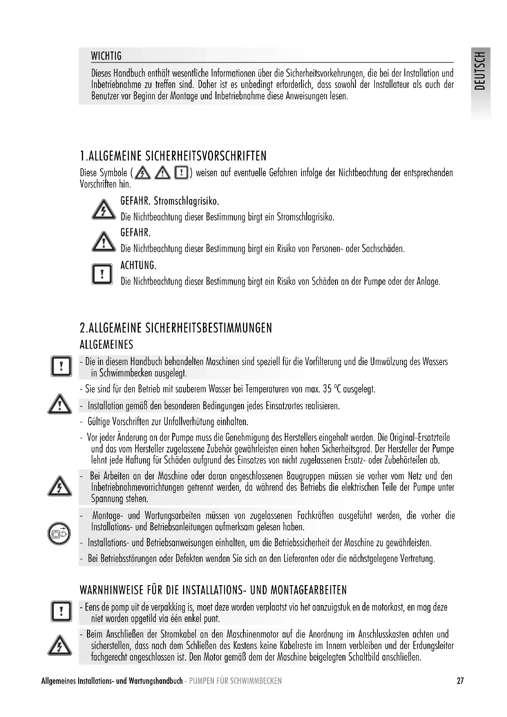 Collegamenti della morsettiera non corretti Stringere correttamente il cavo con il terminale / adeguare la misura del collegamento del cavo ai terminali della morsettieraDEUTSCH Allgemeines Installations- und Wartungshandbuch - PUMPEN FÜR SCHWIMMBECKEN 27 WICHTIG Dieses Handbuch enthält wesentliche Informationen über die Sicherheitsvorkehrungen, die bei der Installation und Inbetriebnahme zu treffen sind. Daher ist es unbedingt erforderlich, dass sowohl der Installateur als auch der Benutzer vor Beginn der Montage und Inbetriebnahme diese Anweisungen lesen. 1.ALLGEMEINE SICHERHEITSVORSCHRIFTEN Diese Symbole ( ) weisen auf eventuelle Gefahren infolge der Nichtbeachtung der entsprechenden Vorschriften hin. GEFAHR. Stromschlagrisiko. Die Nichtbeachtung dieser Bestimmung birgt ein Stromschlagrisiko. GEFAHR. Die Nichtbeachtung dieser Bestimmung birgt ein Risiko von Personen- oder Sachschäden. ACHTUNG. Die Nichtbeachtung dieser Bestimmung birgt ein Risiko von Schäden an der Pumpe oder der Anlage. 2.ALLGEMEINE SICHERHEITSBESTIMMUNGEN ALLGEMEINES - Die in diesem Handbuch behandelten Maschinen sind speziell für die Vorfilterung und die Umwälzung des Wassers in Schwimmbecken ausgelegt. - Sie sind für den Betrieb mit sauberem Wasser bei Temperaturen von max. 35 ºC ausgelegt. - Installation gemäß den besonderen Bedingungen jedes Einsatzortes realisieren. - Gültige Vorschriften zur Unfallverhütung einhalten. - Vor jeder Änderung an der Pumpe muss die Genehmigung des Herstellers eingeholt werden. Die Original-Ersatzteile und das vom Hersteller zugelassene Zubehör gewährleisten einen hohen Sicherheitsgrad. Der Hersteller der Pumpe lehnt jede Haftung für Schäden aufgrund des Einsatzes von nicht zugelassenen Ersatz- oder Zubehörteilen ab. - Bei Arbeiten an der Maschine oder daran angeschlossenen Baugruppen müssen sie vorher vom Netz und den Inbetriebnahmevorrichtungen getrennt werden, da während des Betriebs die elektrischen Teile der Pumpe unter Spannung stehen. - Montage- und Wartungsarbeiten müssen von zugelassenen Fachkräften ausgeführt werden, die vorher die Installations- und Betriebsanleitungen aufmerksam gelesen haben. - Installations- und Betriebsanweisungen einhalten, um die Betriebssicherheit der Maschine zu gewährleisten. - Bei Betriebsstörungen oder Defekten wenden Sie sich an den Lieferanten oder die nächstgelegene Vertretung. WARNHINWEISE FÜR DIE INSTALLATIONS- UND MONTAGEARBEITEN - Eens de pomp uit de verpakking is, moet deze worden verplaatst via het aanzuigstuk en de motorkast, en mag deze niet worden opgetild via één enkel punt. - Beim Anschließen der Stromkabel an den Maschinenmotor auf die Anordnung im Anschlusskasten achten und sicherstellen, dass nach dem Schließen des Kastens keine Kabelreste im Innern verbleiben und der Erdungsleiter fachgerecht angeschlossen ist. Den Motor gemäß dem der Maschine beigelegten Schaltbild anschließen.DEUTSCH PUMPEN FÜR SCHWIMMBECKEN - Allgemeines Installations- und Wartungshandbuch28 - Sicherstellen, dass die Anschlüsse der Stromkabel im Klemmenkasten der Maschine ordentlich eingesteckt sind und die Anschlussklemmen angezogen wurden. - Das Gerät muss an einen (siehe Daten auf der Plakette mit den Eigenschaften der Pumpe) Wechselstromanschluß mit Erdung angeschlossen werden. Dieser muss durch ein Differential (RCD) mit höchstens 30 mA gesichert sein. - Dichtung des Klemmenkastens des Elektromotors richtig einsetzen, um den Eintritt von Wasser zu verhindern. Ebenso sicherstellen, dass die Stopfbüchse in der Kabeldurchführung des Klemmenkastens eingesetzt und angezogen wurde. - Insbesondere darauf achten, dass unter keinen Umständen Wasser in den Motor und die spannungsführenden Teile eindringen kann. - Bei anderweitiger Verwendung als angegeben sind Umbauten und ergänzende technische Vorschriften erforderlich.