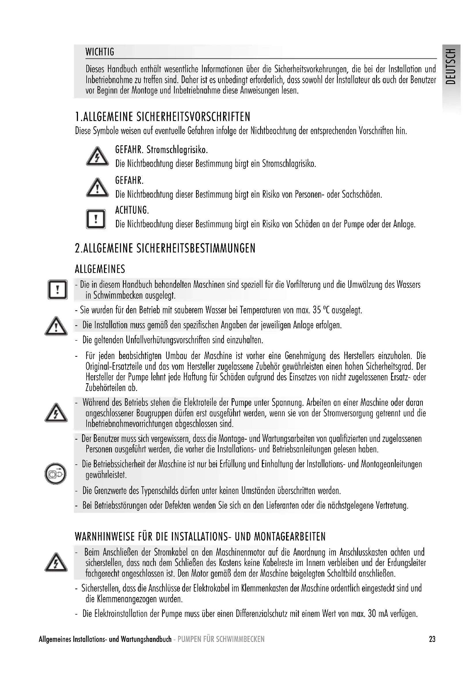 Allgemeines Installations- und Wartungshandbuch - PUMPEN FÜR SCHWIMMBECKEN 23 WICHTIG Dieses Handbuch enthält wesentliche Informationen über die Sicherheitsvorkehrungen, die bei der Installation und Inbetriebnahme zu treffen sind. Daher ist es unbedingt erforderlich, dass sowohl der Installateur als auch der Benutzer vor Beginn der Montage und Inbetriebnahme diese Anweisungen lesen. 1.ALLGEMEINE SICHERHEITSVORSCHRIFTEN Diese Symbole weisen auf eventuelle Gefahren infolge der Nichtbeachtung der entsprechenden Vorschriften hin. GEFAHR. Stromschlagrisiko. Die Nichtbeachtung dieser Bestimmung birgt ein Stromschlagrisiko. GEFAHR. Die Nichtbeachtung dieser Bestimmung birgt ein Risiko von Personen- oder Sachschäden. ACHTUNG. Die Nichtbeachtung dieser Bestimmung birgt ein Risiko von Schäden an der Pumpe oder der Anlage. 2.ALLGEMEINE SICHERHEITSBESTIMMUNGEN ALLGEMEINES - Die in diesem Handbuch behandelten Maschinen sind speziell für die Vorfilterung und die Umwälzung des Wassers in Schwimmbecken ausgelegt. - Sie wurden für den Betrieb mit sauberem Wasser bei Temperaturen von max. 35 ºC ausgelegt. - Die Installation muss gemäß den spezifischen Angaben der jeweiligen Anlage erfolgen. - Die geltenden Unfallverhütungsvorschriften sind einzuhalten. - Für jeden beabsichtigten Umbau der Maschine ist vorher eine Genehmigung des Herstellers einzuholen. Die Original-Ersatzteile und das vom Hersteller zugelassene Zubehör gewährleisten einen hohen Sicherheitsgrad. Der Hersteller der Pumpe lehnt jede Haftung für Schäden aufgrund des Einsatzes von nicht zugelassenen Ersatz- oder Zubehörteilen ab. - Während des Betriebs stehen die Elektroteile der Pumpe unter Spannung. Arbeiten an einer Maschine oder daran angeschlossener Baugruppen dürfen erst ausgeführt werden, wenn sie von der Stromversorgung getrennt und die Inbetriebnahmevorrichtungen abgeschlossen sind. - Der Benutzer muss sich vergewissern, dass die Montage- und Wartungsarbeiten von qualifizierten und zugelassenen Personen ausgeführt werden, die vorher die Installations- und Betriebsanleitungen gelesen haben. - Die Betriebssicherheit der Maschine ist nur bei Erfüllung und Einhaltung der Installations- und Montageanleitungen gewährleistet. - Die Grenzwerte des Typenschilds dürfen unter keinen Umständen überschritten werden. - Bei Betriebsstörungen oder Defekten wenden Sie sich an den Lieferanten oder die nächstgelegene Vertretung. WARNHINWEISE FÜR DIE INSTALLATIONS- UND MONTAGEARBEITEN - Beim Anschließen der Stromkabel an den Maschinenmotor auf die Anordnung im Anschlusskasten achten und sicherstellen, dass nach dem Schließen des Kastens keine Kabelreste im Innern verbleiben und der Erdungsleiter fachgerecht angeschlossen ist. Den Motor gemäß dem der Maschine beigelegten Schaltbild anschließen. - Sicherstellen, dass die Anschlüsse der Elektrokabel im Klemmenkasten der Maschine ordentlich eingesteckt sind und die Klemmenangezogen wurden. - Die Elektroinstallation der Pumpe muss über einen Differenzialschutz mit einem Wert von max. 30 mA verfügen.DEUTSCH PUMPEN FÜR SCHWIMMBECKEN - Allgemeines Installations- und Wartungshandbuch24 - Prüfen, dass die Dichtung des Klemmenkastens richtig eingesetzt ist, damit kein Wasser in den Klemmenkasten des Elektromotors eindringen kann. Weiterhin sicherstellen, dass die Stopfbüchse in der Kabeldurchführung des Klemmenkastens eingesetzt und angezogen wurde. - Insbesondere ist darauf zu achten, dass unter keinen Umständen Wasser in den Motor und in spannungsführende Elektroteile eindringen kann. - Bei anderweitiger Verwendung als angegeben könnten Umbauten und ergänzende technische Vorschriften erforderlich sein.