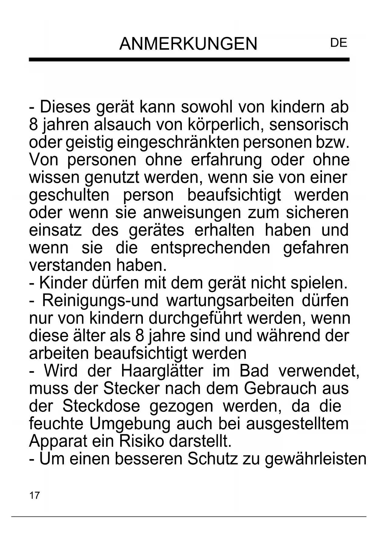 EMBALLAGES An de respecter l’environnement, les matériaux d’emballage doivent être éliminés correctement, conformément à la collecte sélective. Vériez les réglementations locales.- Dieses gerät kann sowohl von kindern ab 8 jahren alsauch von körperlich, sensorisch oder geistig eingeschränkten personen bzw. Von personen ohne erfahrung oder ohne wissen genutzt werden, wenn sie von einer geschulten person beaufsichtigt werden oder wenn sie anweisungen zum sicheren einsatz des gerätes erhalten haben und wenn sie die entsprechenden gefahren verstanden haben. - Kinder dürfen mit dem gerät nicht spielen. - Reinigungs-und wartungsarbeiten dürfen nur von kindern durchgeführt werden, wenn diese älter als 8 jahre sind und während der arbeiten beaufsichtigt werden - Wird der Haarglätter im Bad verwendet, muss der Stecker nach dem Gebrauch aus der Steckdose gezogen werden, da die feuchte Umgebung auch bei ausgestelltem Apparat ein Risiko darstellt. - Um einen besseren Schutz zu gewährleisten, ANMERKUNGEN