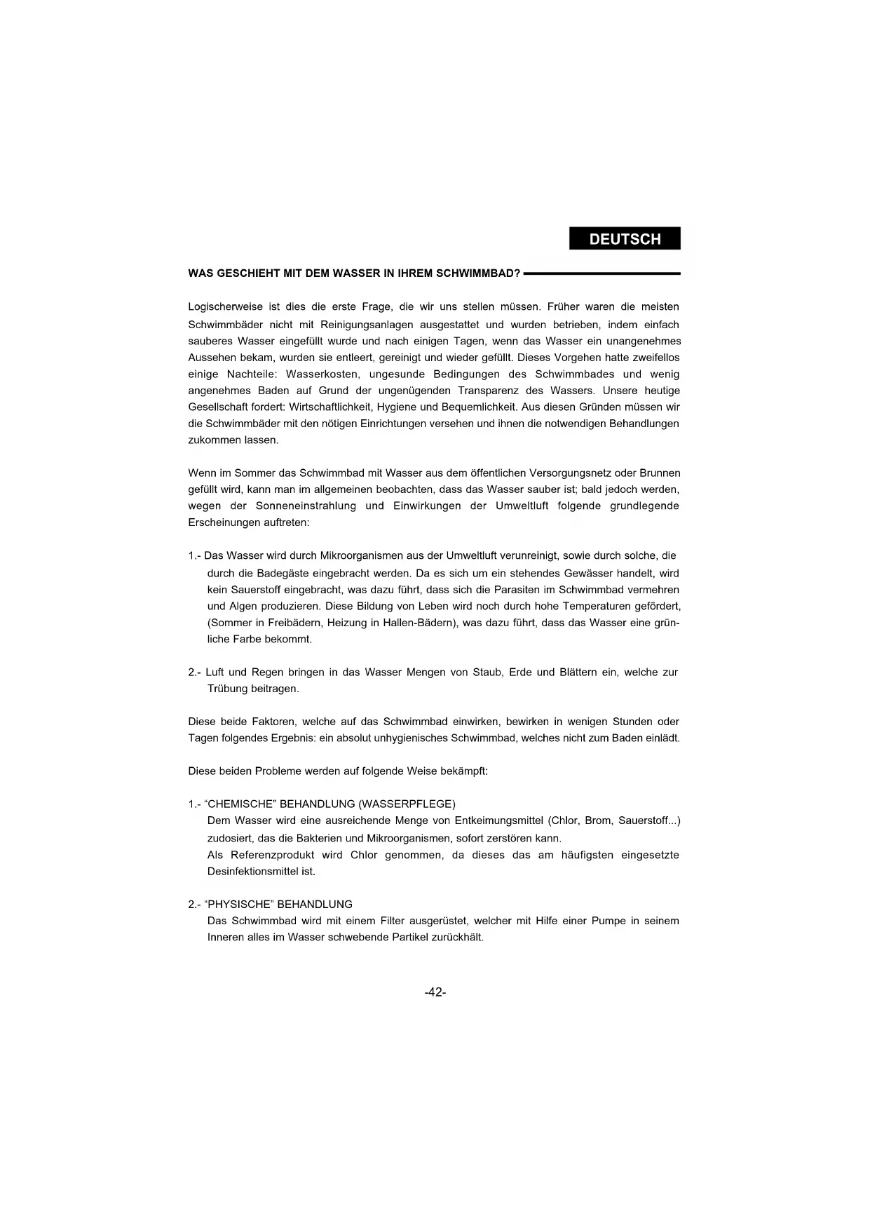 Filtro con capelli intasato. Pulire il filtro dai capelli. Motore che gira nel senso inverso. Controllare la freccia che esiste sul corpo del motore, ne caso girase nel senso inverso, invertire il collegamento dei fili *. Il filtro da poca portata di acqua filtrata. L’aspirafango aspira con poca acqua. Tubi di aspirazione e di mandata intasati. Procedere alla pulizia. pH dell’acqua elevato (acqua torbida). Diminuire il pH con Astral pH Minor. La pressione si eleva rapidamente durante il ciclo di filtrazione. Mancanza di cloro (Acqua verde). Aggiungere Cloro. La pompa aspira aria. Pulire il cestello del prefiltro ed eventualmente le tubazioni di aspirazione. Manometro di pressione che oscilla con una certa violenza. Aspirazione semi-chiusa. Controllare che le valvole di aspirazione siano totalmente aperte.Non bisogna pulire l'insieme del coperchio con nessun genere di dissolvente, dato che potrebbe perdere le sue proprietà (brillantezza, trasparenza,…) Dato che tutte le unioni vengono realizzate con giunte, non è necessario stringere eccessivamente i bulloni, per evitare la rottura dei vari pezzi di plastica. -41-WAS GESCHIEHT MIT DEM WASSER IN IHREM SCHWIMMBAD? Logischerweise ist dies die erste Frage, die wir uns stellen müssen. Früher waren die meisten Schwimmbäder nicht mit Reinigungsanlagen ausgestattet und wurden betrieben, indem einfach sauberes Wasser eingefüllt wurde und nach einigen Tagen, wenn das Wasser ein unangenehmes Aussehen bekam, wurden sie entleert, gereinigt und wieder gefüllt. Dieses Vorgehen hatte zweifellos einige Nachteile: Wasserkosten, ungesunde Bedingungen des Schwimmbades und wenig angenehmes Baden auf Grund der ungenügenden Transparenz des Wassers. Unsere heutige Gesellschaft fordert: Wirtschaftlichkeit, Hygiene und Bequemlichkeit. Aus diesen Gründen müssen wir die Schwimmbäder mit den nötigen Einrichtungen versehen und ihnen die notwendigen Behandlungen zukommen lassen. Wenn im Sommer das Schwimmbad mit Wasser aus dem öffentlichen Versorgungsnetz oder Brunnen gefüllt wird, kann man im allgemeinen beobachten, dass das Wasser sauber ist; bald jedoch werden, wegen der Sonneneinstrahlung und Einwirkungen der Umweltluft folgende grundlegende Erscheinungen auftreten: 1.- Das Wasser wird durch Mikroorganismen aus der Umweltluft verunreinigt, sowie durch solche, die durch die Badegäste eingebracht werden. Da es sich um ein stehendes Gewässer handelt, wird kein Sauerstoff eingebracht, was dazu führt, dass sich die Parasiten im Schwimmbad vermehren und Algen produzieren. Diese Bildung von Leben wird noch durch hohe Temperaturen gefördert, (Sommer in Freibädern, Heizung in Hallen-Bädern), was dazu führt, dass das Wasser eine grün- liche Farbe bekommt. 2.- Luft und Regen bringen in das Wasser Mengen von Staub, Erde und Blättern ein, welche zur Trübung beitragen. Diese beide Faktoren, welche auf das Schwimmbad einwirken, bewirken in wenigen Stunden oder Tagen folgendes Ergebnis: ein absolut unhygienisches Schwimmbad, welches nicht zum Baden einlädt. Diese beiden Probleme werden auf folgende Weise bekämpft: 1.- “CHEMISCHE” BEHANDLUNG (WASSERPFLEGE) Dem Wasser wird eine ausreichende Menge von Entkeimungsmittel (Chlor, Brom, Sauerstoff...) zudosiert, das die Bakterien und Mikroorganismen, sofort zerstören kann. Als Referenzprodukt wird Chlor genommen, da dieses das am häufigsten eingesetzte Desinfektionsmittel ist.