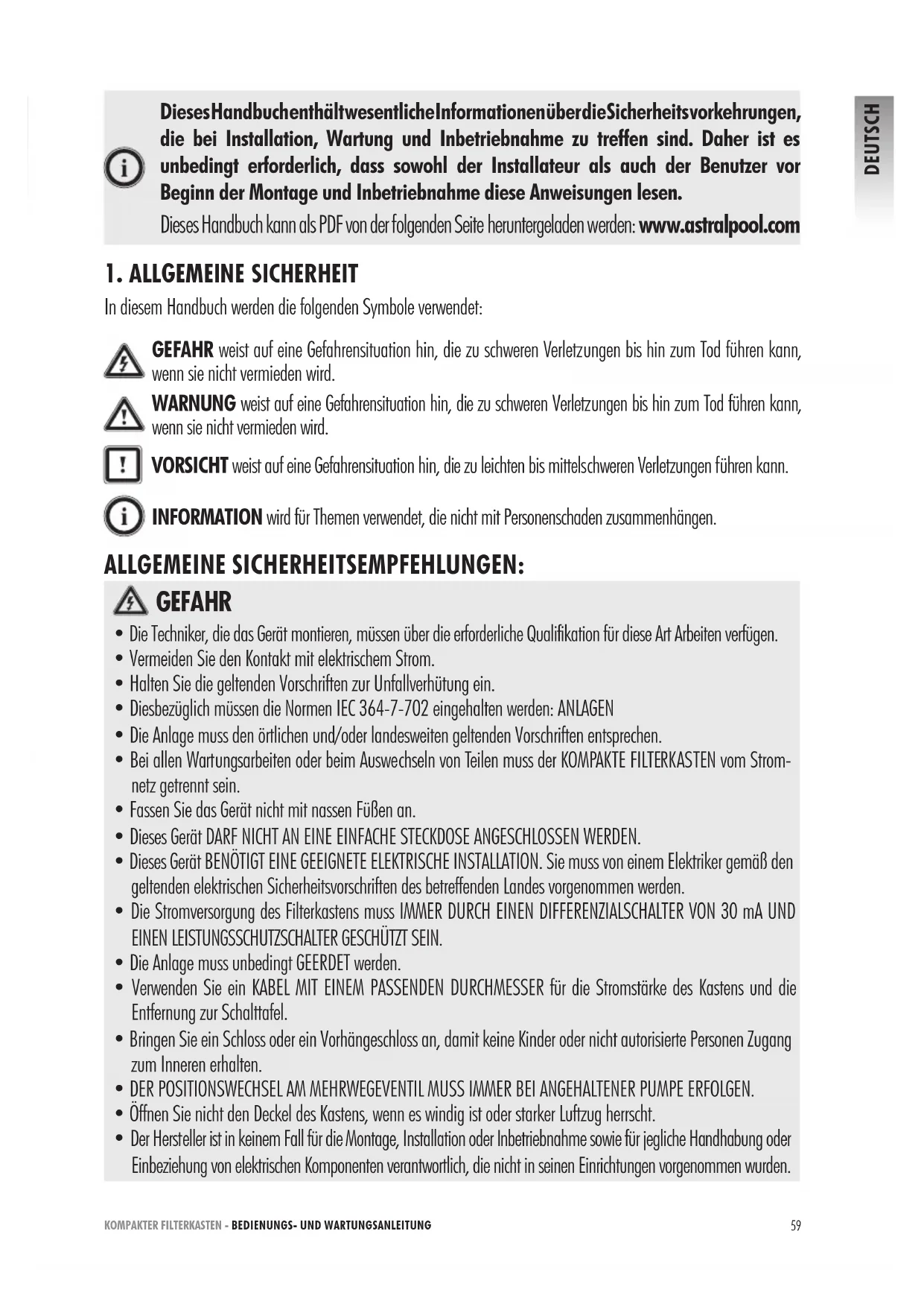 In diesem Handbuch werden die folgenden Symbole verwendet: GEFAHR weist auf eine Gefahrensituation hin, die zu schweren Verletzungen bis hin zum Tod führen kann, wenn sie nicht vermieden wird. WARNUNG weist auf eine Gefahrensituation hin, die zu schweren Verletzungen bis hin zum Tod führen kann, wenn sie nicht vermieden wird. VORSICHT weist auf eine Gefahrensituation hin, die zu leichten bis mittelschweren Verletzungen führen kann. INFORMATION wird für Themen verwendet, die nicht mit Personenschaden zusammenhängen. Dieses Handbuch enthält wesentliche Informationen über die Sicherheits vorkehrungen, die bei Installation, Wartung und Inbetriebnahme zu treffen sind. Daher ist es unbedingt erforderlich, dass sowohl der Installateur als auch der Benutzer vor Beginn der Montage und Inbetriebnahme diese Anweisungen lesen. Dieses Handbuch kann als PDF von der folgenden Seite heruntergeladen werden: www.astralpool.com GEFAHR