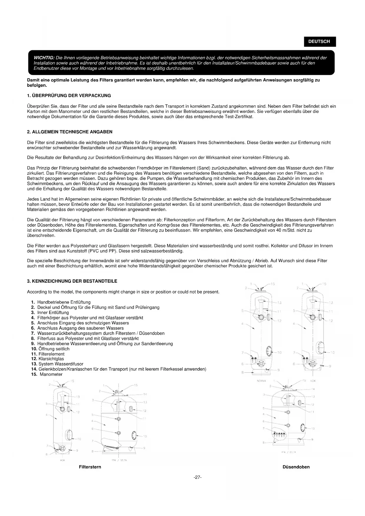 Filterstern Düsendoben WICHTIG: Die Ihnen vorliegende Betriebsanweisung beinhaltet wichtige Informationen bzgl. der notwendigen Sicherheitsmassnahmen während der Installation sowie auch während der Inbetriebnahme. Es ist deshalb unentbehrlich für den Installateur/Schwimmbadebauer sowie auch für den Endbenutzer diese vor Montage und vor Inbetriebnahme sorgfältig durchzulesen.-28- DEUTSCH