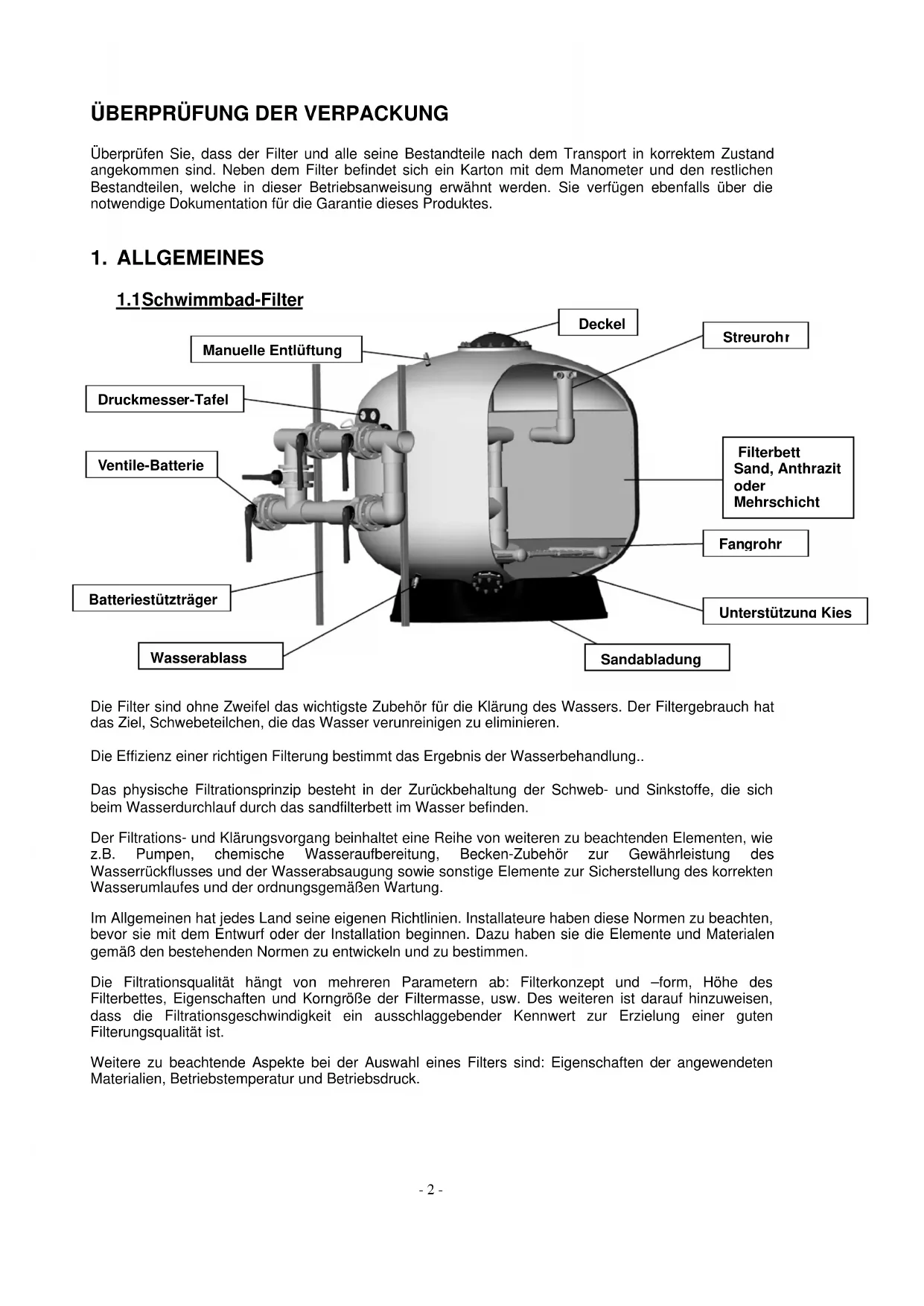 nicht zu überschreiten, wobei zu beachten ist, dass die Filtrationsqualität unmittelbar von der Korngrößenbestimmung des FilterFiltermediumes sowie von der Höhe des Filterbettes abhängig ist. Die Filter sind darauf konstruiert, unter Druck zu arbeiten. Bei einem möglichen Unterdruck (depression) ist die Installation eines Vakuumventils unbedingt erforderlich. Um einen Über- bzw. Unterdruck zu verhindern, muss eine fachgerechte Installation des Filters sichergestellt werden.