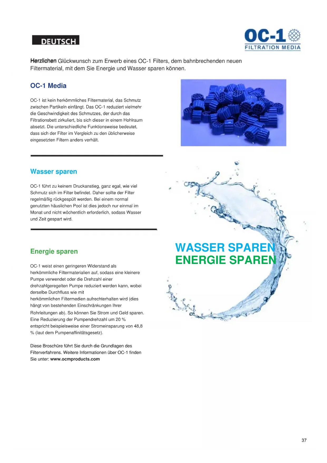 Energie sparen OC-1 weist einen geringeren Widerstand als herkömmliche Filtermaterialien auf, sodass eine kleinere Pumpe verwendet oder die Drehzahl einer drehzahlgeregelten Pumpe reduziert werden kann, wobei derselbe Durchfluss wie mit herkömmlichen Filtermedien aufrechterhalten wird (dies hängt von bestehenden Einschränkungen Ihrer Rohrleitungen ab). So können Sie Strom und Geld sparen. Eine Reduzierung der Pumpendrehzahl um 20 % entspricht beispielsweise einer Stromeinsparung von 48,8 % (laut dem Pumpenaffinitätsgesetz). Diese Broschüre führt Sie durch die Grundlagen des Filterverfahrens. Weitere Informationen über OC-1 finden Sie unter: www.ocmproducts.com WASSER SPAREN ENERGIE SPAREN 37DEUTSCH