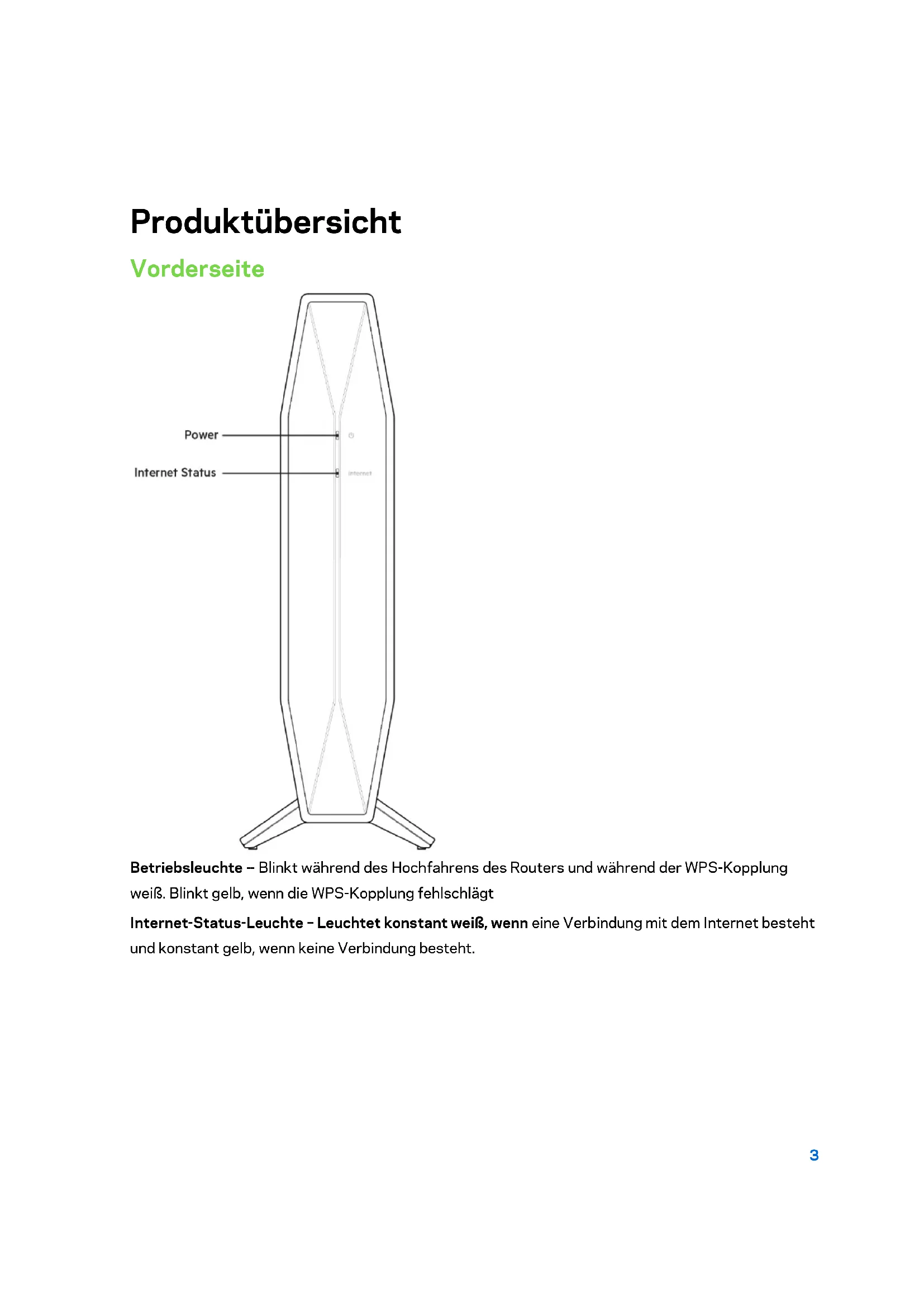 - Betriebsbedingungen Produktübersicht Vorderseite Betriebsleuchte - -- Blinkt während des Hochfahrens des Routers und während der WPS-Kopplung weiß. Blinkt gelb, wenn die WPS-Kopplung fehlschlägt Internet-Status-Leuchte – Leuchtet konstant weiß, wenn eine Verbindung mit dem Internet besteht und konstant gelb, wenn keine Verbindung besteht.4 Rückseite Wi-Fi Protected Setup™-Taste (WPS) (1) – Durch Drücken dieser Taste, können Sie im Nu WLAN- Sicherheit auf Wi-Fi Protected Setup-fähigen Netzwerkgeräten konfigurieren. Die Betriebsleuchte auf der Vorderseite des Routers blinkt während der WPS-Kopplung weiß. Reset-Taste (2) – Halten Sie diese Taste gedrückt, bis die Betriebsleuchte anfängt zu blinken, um den Router auf die Werkseinstellungen zurückzusetzen. Ethernet-Ports (3) - -- Kabelgebundene Geräte lassen sich zur Einbindung in Ihr Netzwerk mit Ethernetkabeln (auch Netzwerkkabel oder Internetkabel genannt) an diese Gigabit-Ethernet-Ports (10/100/1000) anschließen. Internet-Port (4) - -- Ihr Modem lässt sich mit einem Ethernetkabel an diesen Port anschließen. Die Internet-Status-Leuchte auf der Vorderseite des Routers ist nur weiß, wenn der Router mit einem Modem mit Internetverbindung verbunden ist. USB 2.0-Port (5) – Hier können Sie einen USB-Stick anschließen, den Sie für das ganze Netzwerk freigeben können. Stromanschluss (6) - -- Hier können Sie das enthaltene Netzteil anschließen. Ein/Aus-Schalter (7) – Drücken Sie | (ON) [Ein], um den Router einzuschalten.5 Einrichtung: Grundlagen Hier finden Sie weitere Unterstützung Außer in diesem Benutzerhandbuch erhalten Sie unter Belkin.com/support/RT3200 Hilfe in Form von Dokumentation, Downloads, FAQs (häufig gestellten Fragen), technischem Support, Live-Chats und Foren. Hinweis: Lizenzen und Hinweise zur Software Dritter, die auf diesem Produkt zum Einsatz kommt, finden Sie hier: http://www.belkin.com/support/license/. Antworten auf Fragen und Informationen zum GPL-Quellcode finden Sie unter: http://www.belkin.com/support/gplcodecenter/. Ihren Router installieren p. 213